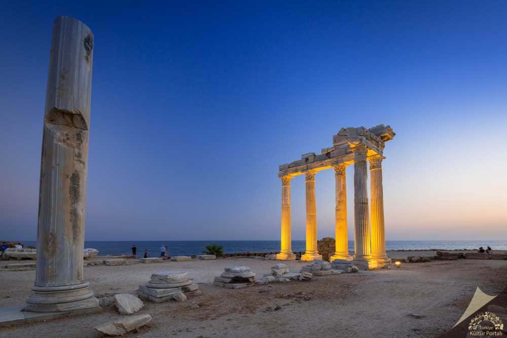 Kentin sütunlu caddesinin sonunda ve antik limanın hemen girişinde Apollon Tapınağı yer alır. Side ile özdeşleşen bu tapınak, hemen yanı başındaki Athena Tapınağı ile birlikte Roma Barışı olarak bilinen dönemde, Side’nin baş tanrısı ve baş tanrıçası adına yapılmıştır.