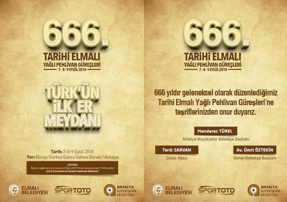 “Türk'ün İlk Er Meydanı” olarak bilinen ve geçmişi Kırkpınar'dan da eskiye dayanan “Tarihi Elmalı Yağlı Pehlivan Güreşleri” bu yıl 666. kez olmak üzere, 7-8-9 Eylül 2018 tarihlerinde, Recep Gürbüz Güreş Sahası'nda gerçekleştirilecek.