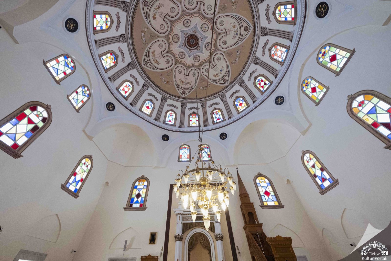 Caminin kubbe kasnağında yuvarlak kemerli on altı pencere yer alır. Her pencere arası yağlı boya ile iyon tarzında sütunlarla işlenmiştir. Yuvarlak kemerli mihrap nişinin iki yanındaki sütünceler ve bunlar üzerindeki alınlık ise barok karakterdedir.