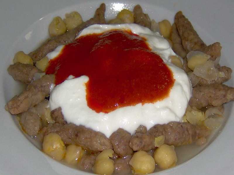 1 kilo kıymanın içine rendelenmiş soğan, karabiber, tuz, yumurta ilave edilip yavaş yavaş yoğrulmaya başlanır. Daha sonra içine azar azar un ilave edilerek iyice yoğrulur ve kulak memesi kıvamına geldiği zaman, fındık büyüklüğünde parçalara ayrılarak avuç ortasında yuvarlanır. Yuvarlamalar bir tavada kızartılır. Ayrı bir tencerede tereyağı eritilerek tuz, kırmızı biber ve su ilave edilerek kaynamaya bırakılır. Kaynayan su içersinde yuvarlamalar bırakılarak 45 dk pişmesi beklenir. Pişen yemeğin üzerine ezilmiş kese yoğurdu, kızdırılmış yağ içine konulan toz biberli sos dökülerek servis yapılır.
