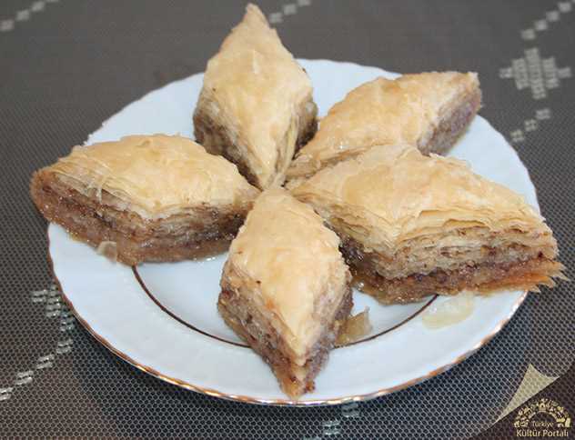 Hamuru için gerekli bütün malzemeler karıştırılıp yoğrulur. 45 – 46 adet çıkan peziler tek tek açılır. Açılan hamurlar tek tek tepsiye yerleştirilir. Her katın arasına eritilmiş margarin ile ceviz dökülür. Önceden ısıtılmamış davul fırına koyulan baklava 10 – 15 dakika kabarana kadar pişirilir. Fırının kapağı açılıp tepsinin altına kerpiç koyulur. Tepsi ara ara çevrilerek baklava 3 saatte pişirilir.