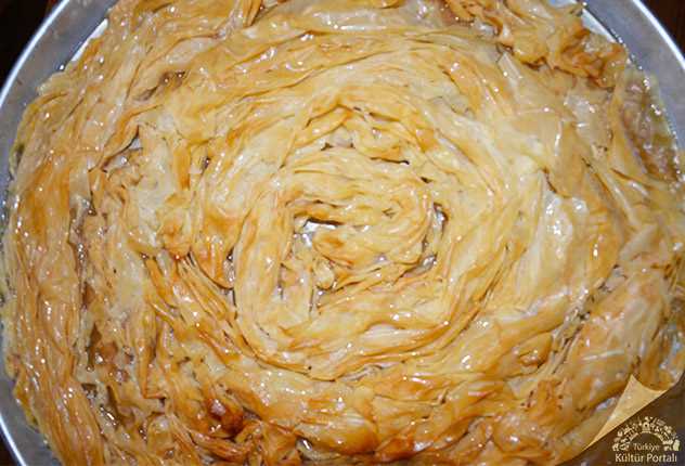 Hamur için gerekli bütün malzemeler karıştırılır. Kulak memesi yumuşaklığında bir hamur elde edilir. Hamur cevizden biraz büyük pezilere ( pazı-parça) ayrılır. Hamur 20 dk dinlendirilir. Dinlendirilen peziler oklava yardımıyla çok ince olacak şekilde açılır. Açılan yufkalar parmakların yardımıyla iteklenerek bir araya toplanır. Yuvarlak şekilde yağlanan tepsiye yerleştirilir. Diğer pezilere de aynı işlem uygulanarak tepsinin geri kalan kısımları doldurulur. Tepsinin üzerine eritilen tereyağı ve sıvıyağ dökülür. 180 derecelik fırında 60 dakika pişirilir. Şerbeti için gerekli malzemeler ayrı bir kapta 5 dk kaynatılır. Soğuyan tatlının üzerine sıcak şerbet dökülür. Arzuya göre üzerine ceviz dökülerek servis edilir.