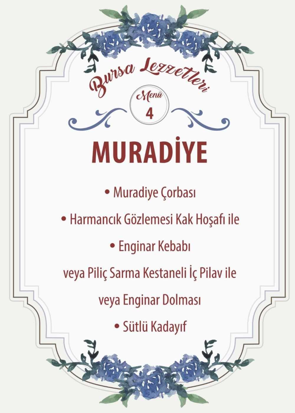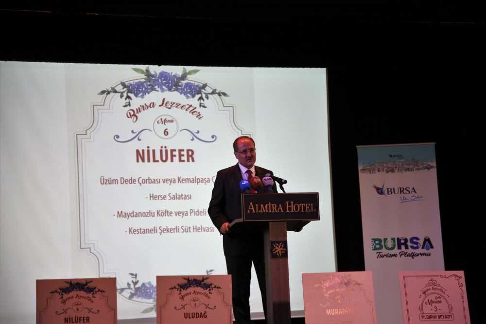 Bursa'nın ulusal ve uluslararası alanlarda tanınması ve markalaşması sürecinde kamu, turizm sektör temsilcileri, ilgili STK' temsilcileri ve İl Kültür ve Turizm Müdürlüğü’nün içinde bulunduğu Bursa Turizm Platformu tarafından 04 Ekim 2018'de gerçekleştirilen “Bursa Yemekleri Çalıştayı” sonucunda; turistik tesis, lokanta, ve otellerimizin kendi menülerine ek olarak Bursa yemekleri menüleri oluşturup, marka olmuş Bursa yemeklerine yeni markalar eklenmesi amacıyla “Bursa Yemekleri Tadımına Davet” programı düzenlenmiştir. Gerçekleştirilen etkinlikte titiz bir çalışma ile oluşturulan Osmangazi, Orhangazi, Yıldırım, Muradiye, Uludağ ve Nilüfer menüleri aşçılar tarafından pişirilerek tanıtımı yapıldı. Vali yardımcımız Mustafa GÜNDOĞAN, Büyükşehir Belediye Başkanı Alinur AKTAŞ ve İl Müdürümüz Ahmet GEDİK, Platform üyeleri ve basın’ın katıldığı etkinlik de davetliler yemeklerin tadına baktı.