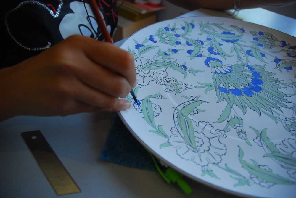Osmanlılar'da sistem olarak sarayda Ehl- Hiraf (Sanatkar Topluluğu) tarafından üretilen desenler Padişah fermanı ile İznik kadısına gönderilir, İznik Kadısı da atölyeleri idare eden Kaşicibaşı (büyük üstad)'a havale ederek desenlerin atölyelerde kullanılması sağlanırdı. Renklerini ve desenlerini İznik doğasından alan İznik çinileri yapımında kuvars, cam tozu ve kil kullanılmaktadır. Bu malzemeler fırınlanıp öğütüldükten sonra hamur haline getiriliyor kalıplarda şekil verdikten sonra bir hafta kurumaya bırakılıyor daha sonra astarlama yapılarak tekrar kurutuluyor ve 930 derecede fırınlanıyor, bir gün süreyle bu ısıda kalan plakalar fırın kapatıldıktan sonra kapağı açılmadan soğumaya bırakılıyor. Desenleme kısmında parşömen kağıdının üzerine çizilen motifin üzeri iğneye delinip kömür tozu dökülerek desenin plakanın üzerine çıkması sağlanıyor. Boyama işleminden sonra plakalar sırlanarak 1000 derecelik fırında pişiriliyor.