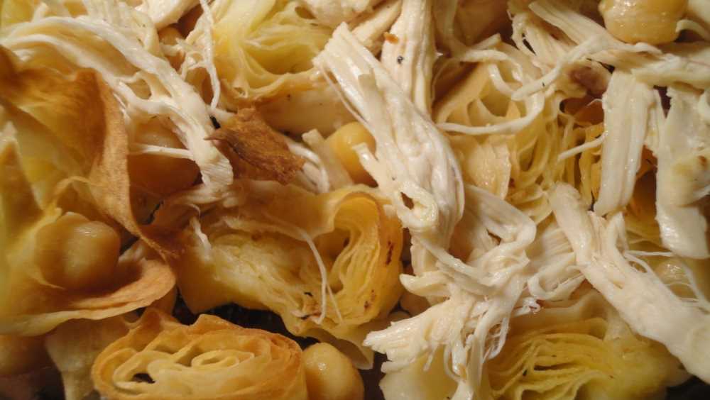 Un, tuz, yumurta ve su ile sert bir hamur yapılır, hamur bezelere ayrılarak yufka şeklinde açılır. Oklavaya sarılan yufkanın içinden oklava çıkartılarak 1 cm kalınlığında kesilir. Elde edilen uzun şeritler tepsiye dizilerek üzerleri fırında kızartılır. Tavuk suda haşlanarak pişirilir, kemiklerinden ayrılarak elle küçük parçalara ayrılır. Nohut başka bir yerde pişirilerek tavuğa eklenir, ocağın üzerinde 5 dakika kaynatıldıktan sonra tepsinin üzerine dökülür. Tavuk ve nohutlar eşit olarak tepsinin üzerine yerleştirildikten sonra suyunu çekmesi için fırında 20 dakika bekletilir. Fırından çıkarıldıktan sonra tereyağı ve kırmızı biber tavada kavrularak tepsinin üzerine gezdirilir. Sıcak olarak servis yapılır.