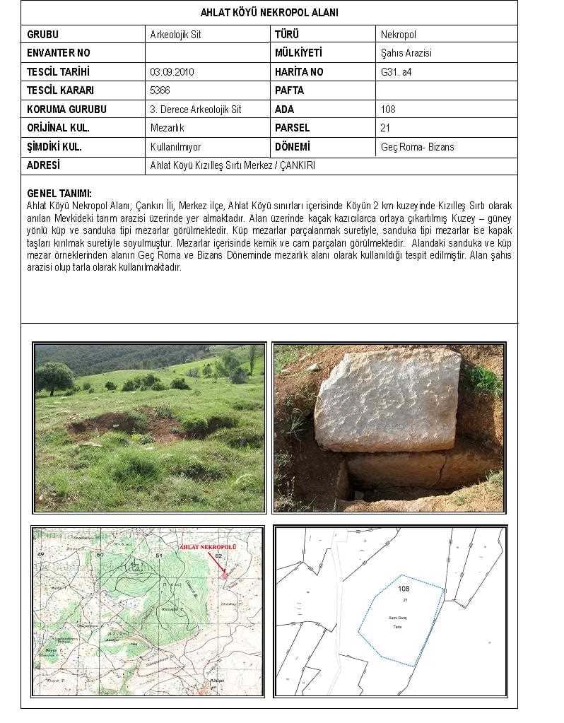 Ahlat Köyü Nekropol Alanı; Çankırı İli, Merkez ilçe, Ahlat Köyü sınırları içerisinde Köyün 2 km kuzeyinde Kızılleş Sırtı olarak anılan Mevkideki tarım arazisi üzerinde yer almaktadır. Alan üzerinde kaçak kazıcılarca ortaya çıkartılmış Kuzey – güney yönlü küp ve sanduka tipi mezarlar görülmektedir. Küp mezarlar parçalanmak suretiyle, sanduka tipi mezarlar ise kapak taşları kırılmak suretiyle soyulmuştur. Mezarlar içerisinde kemik ve cam parçaları görülmektedir. Alandaki sanduka ve küp mezar örneklerinden alanın Geç Roma ve Bizans Döneminde mezarlık alanı olarak kullanıldığı tespit edilmiştir. Alan şahıs arazisi olup tarla olarak kullanılmaktadır. |