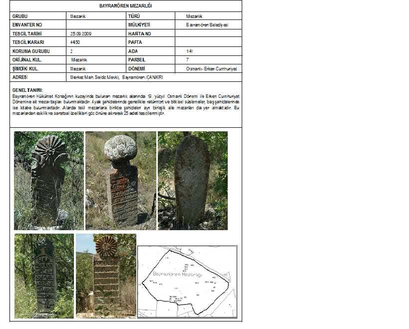 Bayramören Hükümet Konağının kuzeyinde bulunan mezarlık alanında 19. yüzyıl Osmanlı Dönemi ile Erken Cumhuriyet Dönemine ait mezar taşları bulunmaktadır. Ayak şahidelerinde genellikle natürmort ve bitkisel süslemeler, baş şahidelerinde ise kitabe bulunmaktadır. Alanda tekil mezarlarla birlikte şahideleri ayrı birleşik aile mezarları da yer almaktadır. Bu mezarlardan eskilik ve sanatsal özellikleri göz önüne alınarak 25 adeti tescillenmiştir. |