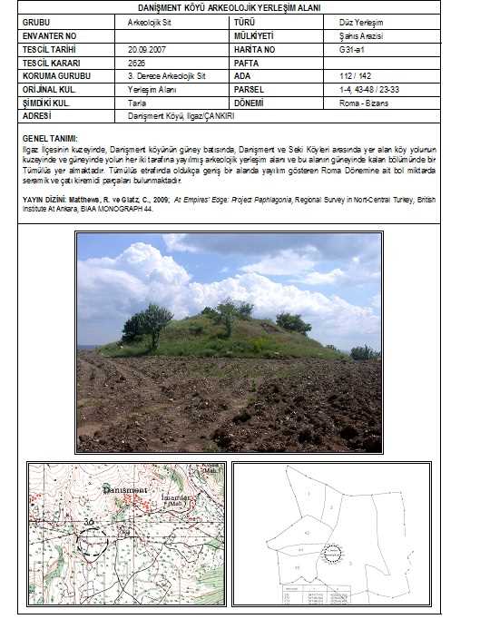 Ilgaz İlçesinin kuzeyinde, Danişment köyünün güney batısında, Danişment ve Seki Köyleri arasında yer alan köy yolunun kuzeyinde ve güneyinde yolun her iki tarafına yayılmış arkeolojik yerleşim alanı ve bu alanın güneyinde kalan bölümünde bir Tümülüs yer almaktadır. Tümülüs etrafında oldukça geniş bir alanda yayılım gösteren Roma Dönemine ait bol miktarda seramik ve çatı kiremidi parçaları bulunmaktadır. |