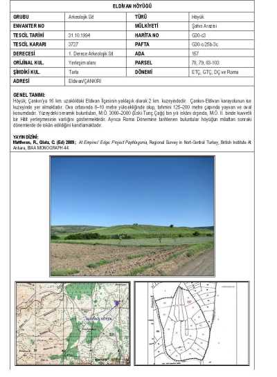 Höyük; Çankırı’ya 20 km. uzaklıktaki Eldivan İlçesinin yaklaşık olarak 2 km. kuzeyinde, Çankırı-Eldivan karayolunun ise 1 km. batısında yer almaktadır. Ova ortasında 8–10 metre yüksekliğinde olup, tahmini 125–200 metre çapında yayvan ve oval konumdadır. Yüzeydeki seramik buluntuları, M.Ö. 3000–2000 (Eski Tunç Çağı) bin yılı iskânı dışında, M.Ö. II. binde kuvvetli bir Hitit yerleşmesinin varlığını göstermektedir. Ayrıca Roma Dönemine tarihlenen buluntular höyüğün milattan sonraki dönemlerde de iskân edildiğini kanıtlamaktadır. |