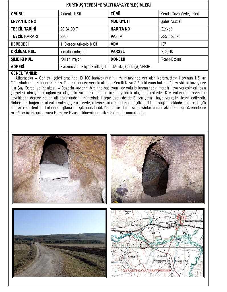 Atkaracalar – Çerkeş ilçeleri arasında, D 100 karayolunun 1 km. güneyinde yer alan Karamustafa Köyünün 1.5 km Güneybatısında bulunan Kurtkuş Tepe sırtlarında yer almaktadır. Yeraltı Kaya Sığınaklarının bulunduğu mevkiinin kuzeyinde Ulu Çay Deresi ve Yalaközü – Bozoğlu köylerini birbirine bağlayan köy yolu bulunmaktadır. Yeraltı kaya yerleşimleri fazla yükseltisi olmayan konglomera oluşumlu yassı bir tepenin içine oyularak oluşturulmuşlardır. Köy yolunun kuzeyindeki kayalıkların dereye bakan alt bölümünde 1, güneyindeki tepe üzerinde de 3 ayrı yeraltı kaya yerleşimi tespit edilmiştir. Birbirinden bağımsız olarak oyulmuş yeraltı yerleşimlerine girişler tepeden küçük deliklerle sağlanmaktadır. İçeride küçük kapılar ve galerilerle birbirine bağlanan beşik tonozlu dikdörtgen ve dairemsi mekânlar bulunmaktadır. Tepe üzerinde ve mekânlar içinde çok sayıda Roma ve Bizans Dönemi seramik parçaları bulunmaktadır. |