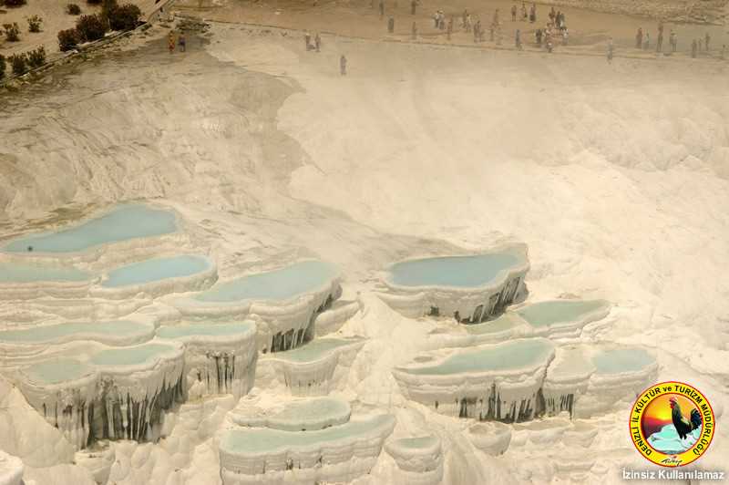 PAMUKKALE TRAVERTENLERİ: Traverten sözcüğü, İtalya’da geniş traverten çökellerinin bulunduğu Tivoli’nin, Roma zamanındaki adı olan “Tivertino”dan gelmektedir. Traverten çok yönlü, çeşitli nedenlere ve ortamlara bağlı, kimyasal reaksiyon sonucu çökelme ile oluşan bir kayadır. Termal su kaynaktan çıktıktan sonra, 320 m. uzunluğunda bir kanal ile traverten başına gelmekte ve buradan, 60-70 m.lik çökelmenin olduğu traverten katkatlarına dökülmekte ve ortalama 240-300 m. yol katetmektedir. Kaynaktan çıkan 35.6 °C sıcaklığında, içinde yüksek miktarda Kalsiyum Hidrokarbonat bulunan suyun havadaki oksijen ile olan teması sırasında Kalsiyum karbonat çökelmekte ve traverten oluşumuna sebep olmaktadır. Çökelti ilk etapta jel halindedir. Beyazlığın oluşumunda hava şartları, ısı kaybı, akışın yayılımı ve süresi etkilidir. Çökelme, termal sudaki karbondioksit, havadaki karbondioksit ile dengeye gelinceye kadar devam eder. Reaksiyon Kimyasal olarak: Ca (HCO3) + O2 --> CaCO+CO2+H2O Travertenler kartlarda ve bröşürlerde göründüğü gibi her zaman su ile temas halinde değildir. Su dolu travertenler daha güzel ve hoş göründüğü için fotoğrafları genellikle su dolu iken çekilir ve her zaman su dolu sanılır.Travertenlere termal su kontrollü olarak belirli bir program dahilinde verilmektedir. Fazla miktarda ve uzun süre aynı yere akıtılan termal su yosunlaşmaya ve dolayısı ile beyaz traverten alanlarında hoş olmayan görüntüye sebep olmaktadır.Hem bu kirliliğin önüne geçmek hem de başlangıçta jel halinde olan çökeltiyi sertleştirmek için traverten alanları belirli süreler kurutulmak zorundadır.
