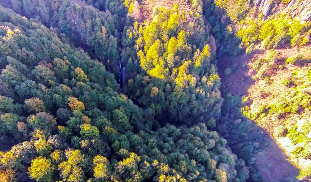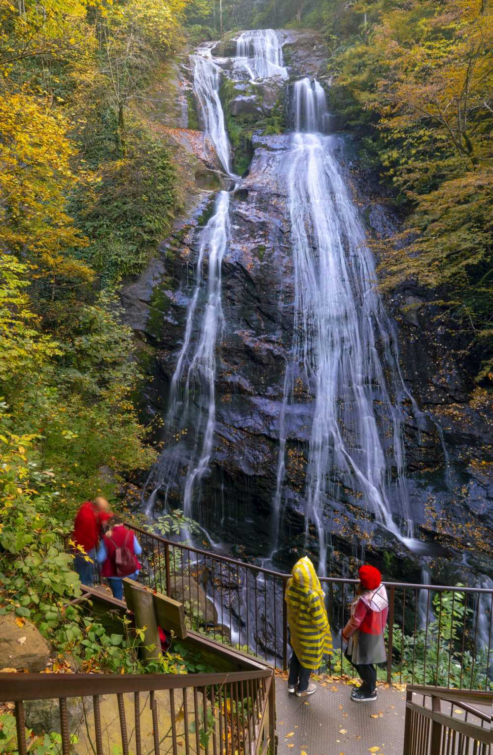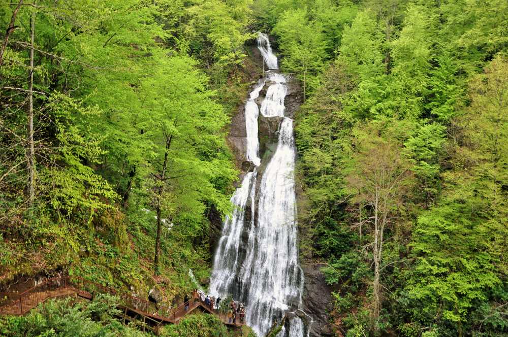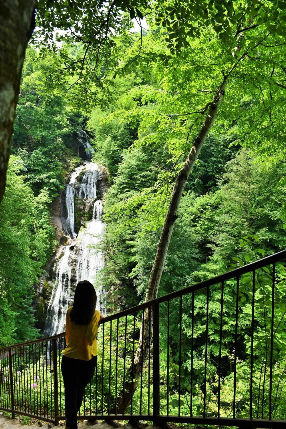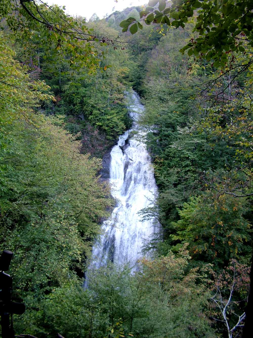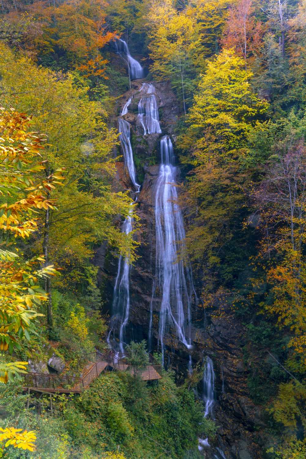 Güzeldere köyünden geçen Bıçkı Deresi üzerinde bulunan şelale, 120 m yükseklikten dökülen suyun doğal coşkusunu dev kayın ve gürgen ağaçlarıyla bütünleştirerek muazzam bir görüntü arz etmektedir. Elmacık Dağı (1.700 m)’na uzanan şelale ve çevresi orman yapısı ile dikkat çekmektedir. Şelalenin bulunduğu alanda, kayın, gürgen, köknar, porsuk, sarıçam, karaçam, kestane, ıhlamur, akçaağaç, dişbudak, ceviz, orman kavağı, orman söğüdü, orman gülü, karayemiş, papaz külahı ağaçları; böğürtlen, üvez, alıç, taflan, kantaron otu, kardelen, arap sümbülü, sıklamen, menekşe, düğün, eğrelti, fiğ, burçak vb. bitkiler görülmektedir.