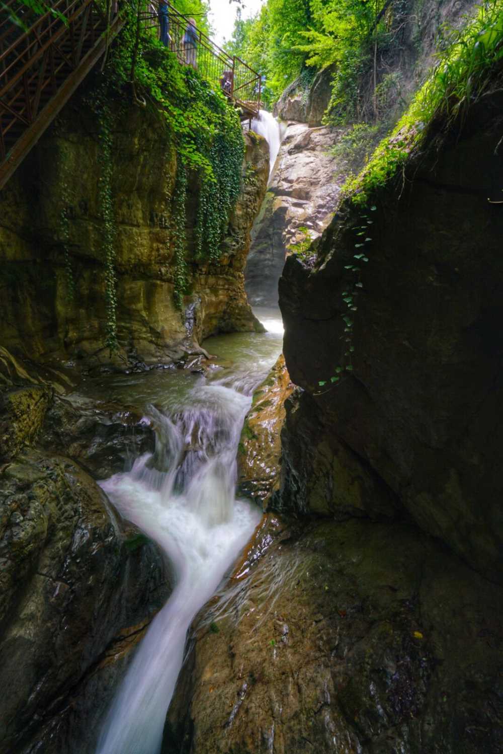 Ağaçların arasından şiddetle akan sular, beyaz köpükler halinde dökülerek cadı kazanı içinde bulunan derin kayalıkların arasında adeta kaynamaktadır. Şelalenin arkasındaki kayanın içinde, doğal olarak oluşan mağara ile bir ara kaybolan sular biraz ilerden tekrar ortaya çıkarak akışını sürdürmektedir.