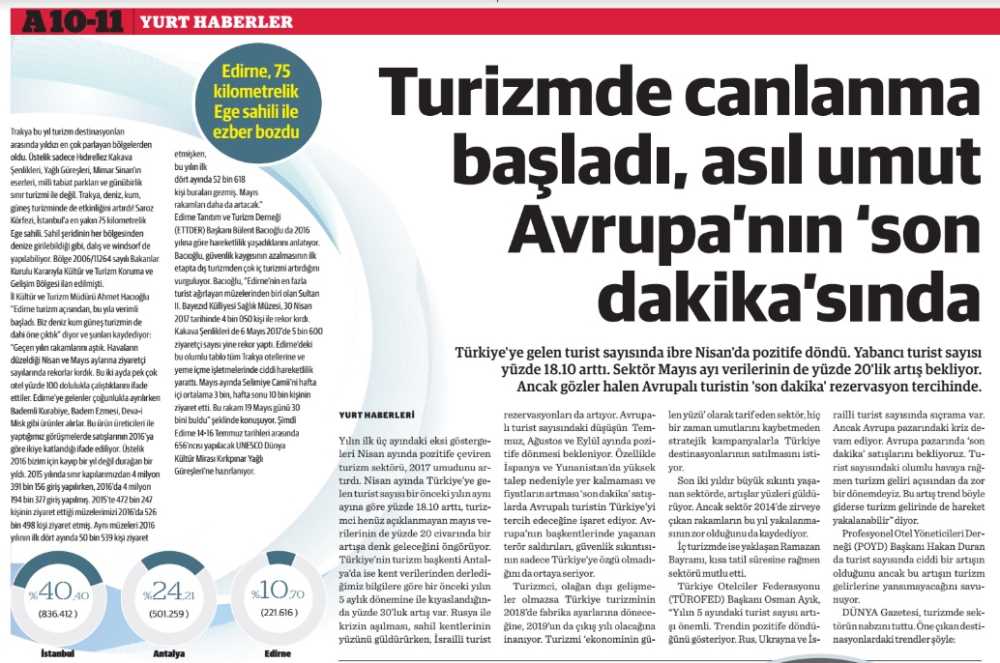 Edirne'nin turizm kapasitesi Dünya Gazetesi tarafından haber yapıldı. Trakya bu yıl turizm destinasyonları arasında yıldızı en çok parlayan bölgelerden oldu. Üstelik sadece Hıdırellez Kakava Şenlikleri, Yağlı Güreşleri, Mimar Sinan’ın eserleri, milli tabiat parkları ve günübirlik sınır turizmi ile değil. Trakya, deniz, kum, güneş turizminde de etkinliğini artırdı! Saroz Körfezi, İstanbul’a en yakın 75 kilometrelik Ege sahili. Sahil şeridinin her bölgesinden denize girilebildiği gibi, dalış ve windsorf de yapılabiliyor. Bölge 2006/11264 sayılı Bakanlar Kurulu Kararıyla Kültür ve Turizm Koruma ve Gelişim Bölgesi ilan edilmişti.