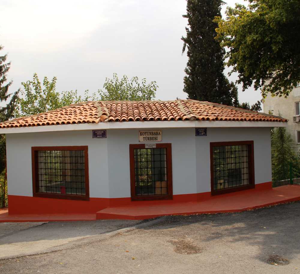 Kendi adını taşıyan tekkesinden herhangi bir eser kalmamıştır. Koyun Baba'nın Sultan 2.Mahmut'a rüyasında görünüp türbesini tamir ettirmesini söylemesi üzerine türbenin tamir ettirildiği kitabede yazılıdır. Türbe dikdörtgen planlı olup kapalı türbeler arasındadır. Türbenin boyutları 4.34*4.67 m.'dir. Türbenin bir penceresi ve giriş kapısı vardır. Üzeri kiremit çatıyla örtülüdür. Türbenin içinde üç mermer lahit yer alır. Türbenin bahçesinde bir kuyu bulunur. Türbenin içinde herhangi bir süsleme yoktur. |