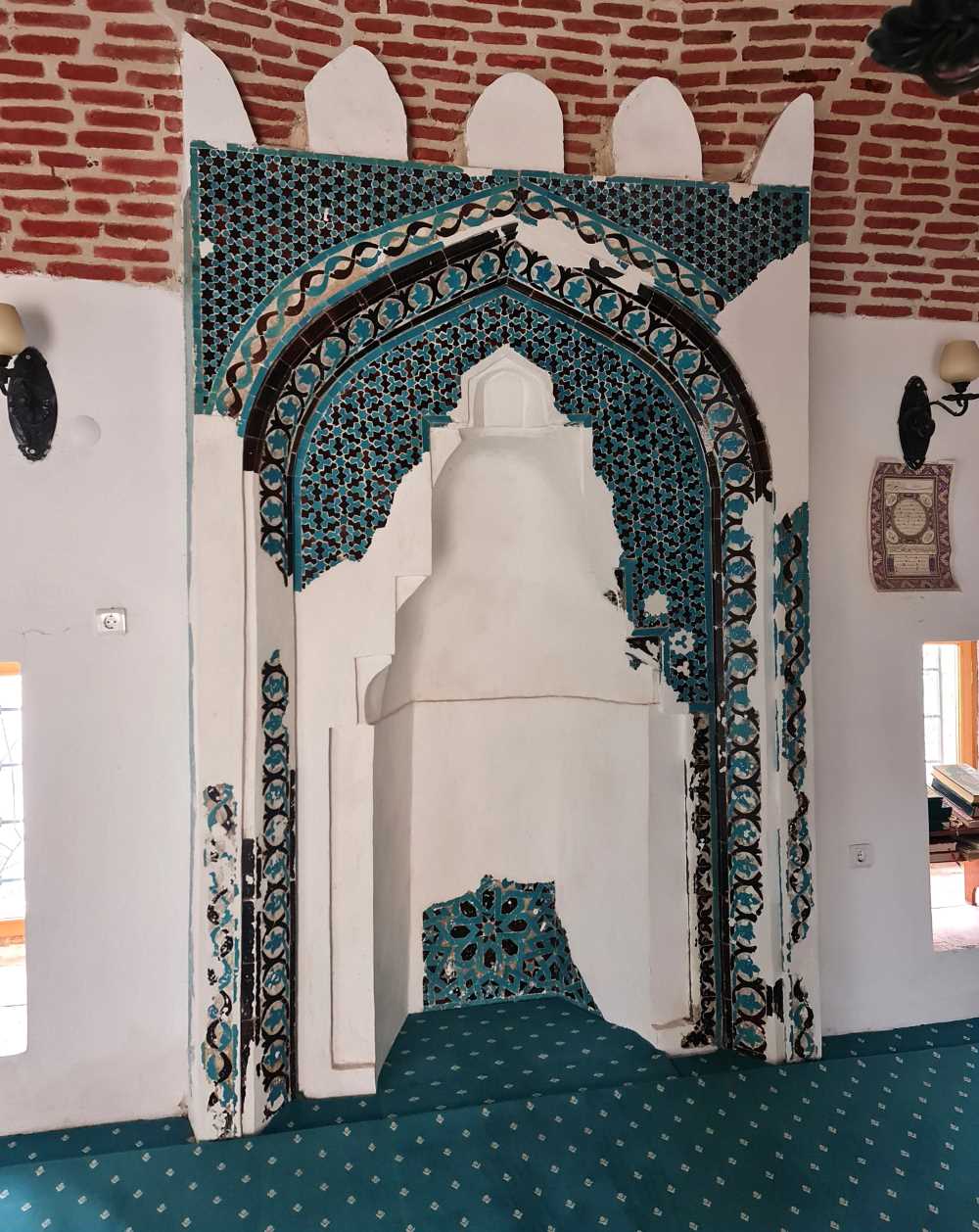 Mescit kısmı: Kare planlı ve üzeri kubbe ile örtülüdür. Kubbeye geçişi sağlayan üçgenlerin ve kubbenin zamanında çini ile kaplı olduğu izlerden anlaşılmaktadır. Kubbe eteğine kadar yükselen mihrap, devrinin güzel örneklerinden biridir. Zamanımıza bozulmadan gelmiştir. Mihrabın sivri kemeri üzerinde üç tam, yanlardan birer yarım den-dan bulunmaktadır. Mihrap nişi kenarında iki sütunce ve mihrap nişi içinde beş sıra halinde stalâktitler bulunur. Tamamen çini ¬ile kaplı mihrapta mavi renk hâkimdir. Mihrabın iki yanında birer pencere, kuzey kıs¬mında ise esas giriş kapısı yer alır. Giriş kapısı yanında minare kapısı, batı tara¬fında türbenin üst katına geçiş veren bir kapı vardır. Giriş kapısı sola kaydırılmıştır. Bunun nedeni sağ tarafta yer alan minaredir. Taç kapının içice iki kemeri mevcuttur. Dış kemer sivri, iç kemer yuvarlaktır. İki kemer arasında alınlık içinde kitabesi vardır. 678 H. (1276 M.) yılında inşa edilmiş minare türbe ile mescit arasında yer alır. Kaidesi kare olup yuvarlak gövdeye geçiş üçgenlerle sağlanmıştır. Kaide taş, gövde tuğladır. Sırça bordürde yazı ve bezeme vardır. Minare üstü yıkıktır.