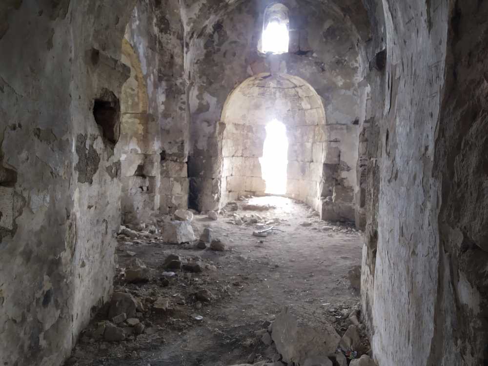 Giriş taş kapı güneybatıdandır. Buradan, paye ve başlık kesik piramidal silindirik dört sütunun tavan ve duvarlara kemerlerle bağlandığı, üç bölmeye (nefe) ayırdığı ilk cemaat yerine geçilir. Bu ilk cemaat odada duvar taşlarında kazı haç motifler, poligonal nişler ve bir de vaftiz nişi, doğu duvarında sağ ve solda iki hücre mekân (çan kule/papaz hazırlık yeri) vardır. Sonra tonozlu bir giriş ve tavanda büyük yüksek kubbe, sağ, sol ve doğu gidiş duvarında taşkın kubbemsi / tonozumsu bölmelerle Kilisenin bir haç planı verildiği asıl taşıyıcı mekân (naos)a geçilir. Dışı kalın beyaz sıva, üstü ince mavi sıvalı, taşlar kemerlerde, yarım tonoz yerlerde, yan duvarları kesen taşıcı payelerde, giriş kapı ve nişlerde düzgün veya konveks taş, yan duvarlar şekilsiz taş, içte ise moloz taşların harçla tutturulduğu, kubbede ise Roma tuğlalar kullanıldığı gözlenmiştir. Naos'taki büyük kubbe tavan yapıya dört kemerle bağlanmaktadır. Her birinin altında üç poligonal pencere vardır. İlk Cemaat yerinde ilginç bir saptama kemerlerin duvarı kestiği yerlerde, dipleri yakın zamanlarda kırılmış olan testi formlu su künkleri benzeri nesnelerin duvara harçla gömülü olmasıdır. (Tam 16 tane sayıldı)