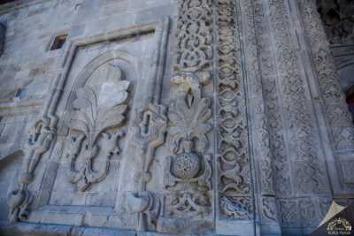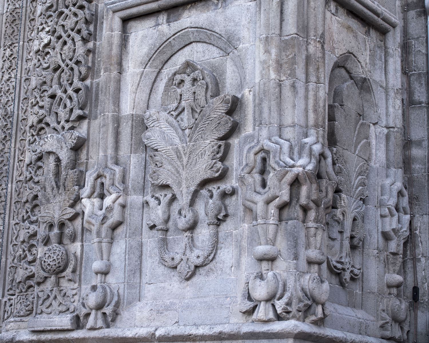 Taç kapının batı tarafına Orta Asya Türkleri'nin simgesi olan çift başlı kartal, ağzı açık iki yılan ve dilimli yapraktan oluşan hayat ağacı işlenmiştir.