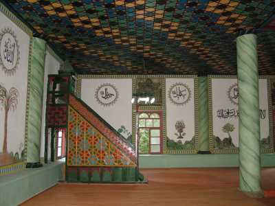 Minarelerde turkuaz rengiyle dikkat çeken panonun içinde Arapça "Allah" yazmaktadır.