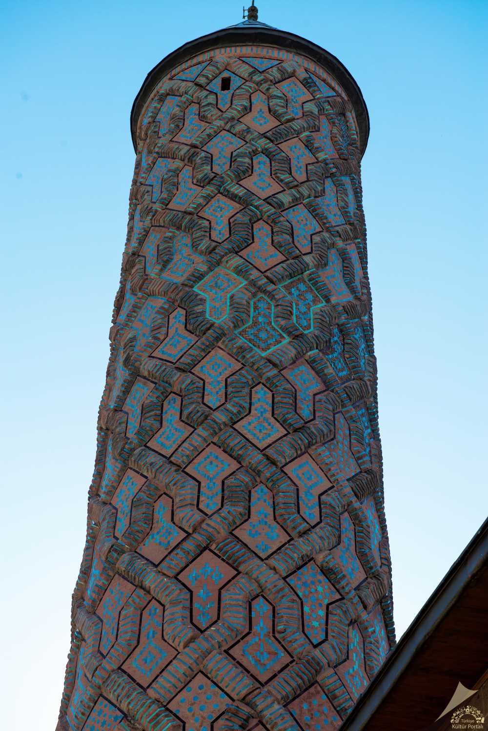 Yapının taç kapısı cepheden dışa taşmaktadır. Dört eyvanlı iç mekânda bulunan dikdörtgen avlunun orta bölümü mukarnaslı bir kubbe ile diğer kısımları ise sivri kemerli beşik tonozlarla örtülüdür. Taç kapının yan yüzlerinde, silme kemerle çevrili nişler içinde pars ve kartal motifleri dikkat çekmektedir. Ajurlu bir küreden çıkan hurma yaprakları, iki pars ve kartal figürlerinden oluşan hayat ağacı Orta Asya Türkleri'nin önemli simgelerini bir araya getirmektedir. Basık kemerli ve oymalı olan taç kapının her tarafını kaplayan bezemeler, muhteşem bir görüntü oluşturmaktadır.