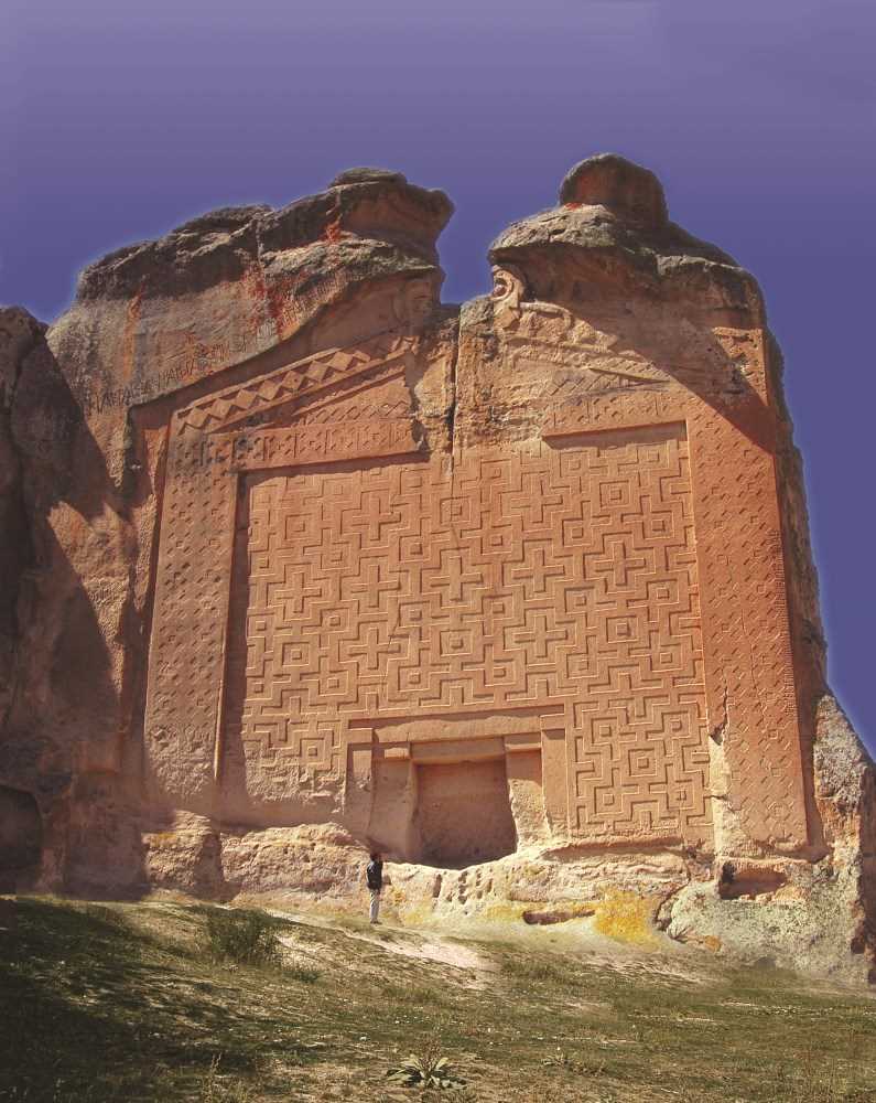Anıtın solundaki nişin içinde bulunan yazıt, nişin sol duvarından başlar, arka duvarı ve sağ duvarı üzerinde devam eder. 4.45 metre uzunluğundadır. 1936 ve 1937 yıllarında, anıtın önünde arkeolojik kazılar yapılmıştır. Ana kayanın üzerinde yer yer 3 metre kalınlığa ulaşan dolgu toprağın altından kuzeye doğru meyilli bir avlu (17mx19m), hemen güneyinde sütunlu bir galeriye ait ana kayaya oyulmuş düzgün bir taban ile 4 adet sütun kaidesi gün ışığına çıkartılmıştır Doğu-batı doğrultusunda uzanan galeri, batı yönde büyük nişle sınırlanmaktadır. Araştırmacılar burada bir anıtsal fasad, üzeri açık bir avlu ve bir sütunlu galeriden meydana gelen, Ana Tanrıça Matar’a adanmış büyük bir açık hava kült kompleksi bulunduğu görüşünde birleşmektedir.