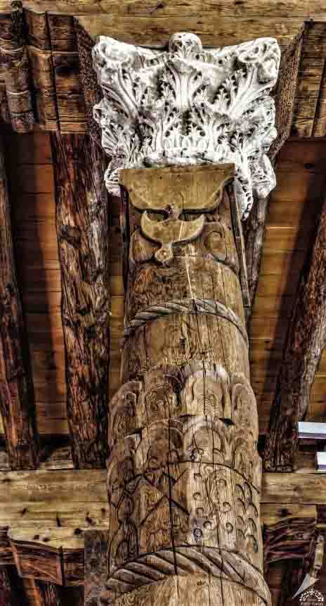 Direkler ardıç ve sarıçam ağacından yapılmıştır. Caminin ortasında, yukarıdan ışık sağlaması için “aydınlık feneri” olarak tabir edilen bir boşluk bulunmaktadır.