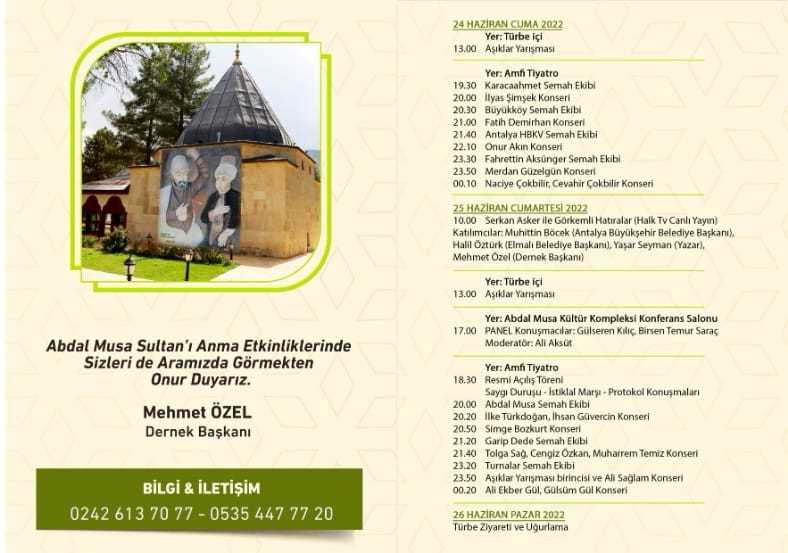 Antalya'nın Elmalı ilçesine bağlı Tekke Mahallesi, 24-26 Haziran 2022 tarihleri arasında, "17. Uluslararası -38. Ulusal Abdal Musa Anma Etkinlikleri"ne ev sahipliği yapacak. T.C. Kültür ve Turizm Bakanlığımızın da desteğiyle; Tekke Köyü Abdal Musa Kültürünü Araştırma ve Yaşatma Derneği tarafından düzenlenen etkinlikler, 24 Haziran'da, Abdal Musa Sultan Türbesi içinde yapılacak âşıklar yarışmasıyla başlayacak. 24 ve 25 Haziran günleri yapılacak semah, panel ve konserlerle devam edecek etkinlik programı, 26 Haziran'daki türbe ziyaretiyle sona erecek. Dünyanın ve Türkiye'nin birçok yerinden siyasetçi, bilim insanı, sanatçı ve konukların katılacağı "Abdal Musa Anma Etkinlikleri"ne tüm yurttaşlarımız davetlidir.