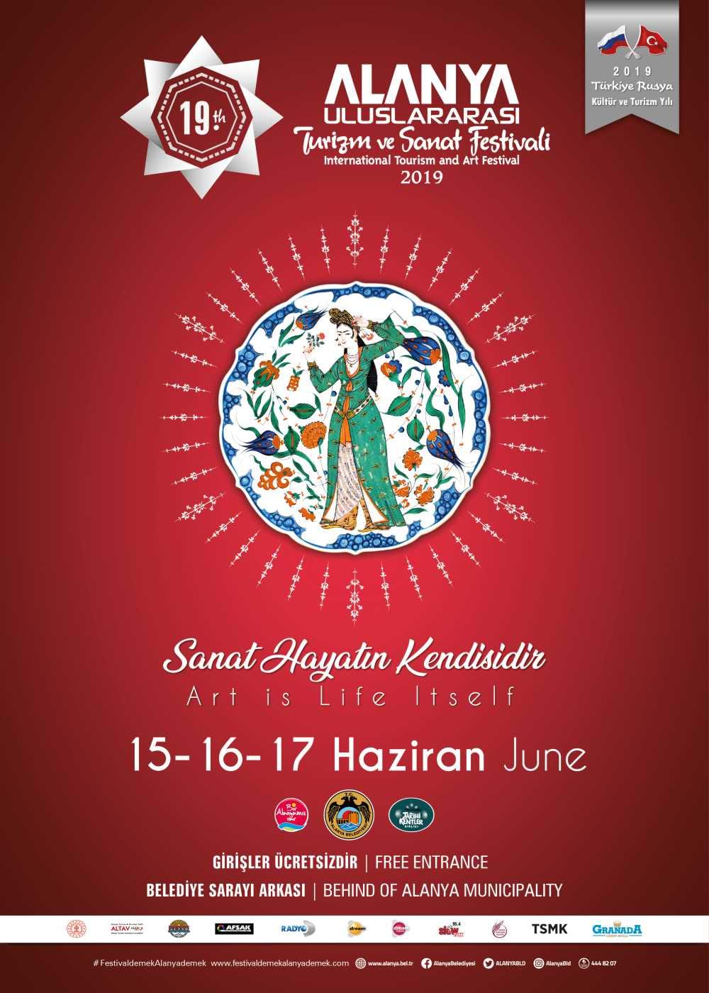 3 gün sürecek olan 19. Alanya Uluslararası Turizm ve Sanat Festivali’nde 15 Haziran akşamı Burak Yeter performansının ardından Türk Sanat Müziği’nin Divası Bülent Ersoy, 16 Haziran akşamı Pascal Nouma performansının ardından Yalın ve 17 Haziran akşamı ünlü DJ Haluk Sarıtaş performansının ardından Süper Star Ajda Pekkan ücretsiz konserleriyle vatandaşlarla buluşacak. Ayrıca her gün açılacak stantlar ve sergilerle Osmanlı Dönemi’nin sanat ve kültürel yapısı ziyaretçilere aktarılacak. Unutulmaya yüz tutmuş gelenek ve görenekler ile kültürlerin geleceğe aktarılmaya çalışıldığı festivalde Alanya’nın mutfak kültürü de katılımcılara yansıtılmaya çalışılacak. Ebru, çini, cam üfleme, takı gibi Türk kültürünü yansıtan sanatların işleneceği festivalde ayrıca Antalya Olgunlaşma Enstitüsü ile birlikte “Osmanlı” temalı bir de defile düzenlenecek. Alanya Belediyesi atölyelerinde hazırlanan koza ürünleri de açılan stantlarda sergilenecek. Öte yandan Polonya ve Letonya temsilcileri de festivalde stant açarak kendi ülkelerine özgü tanıtım materyallerini sergileme imkânı bulacak. Temsili Yörük Göçü ile başlayacak programlara Rusya, Polonya, Letonya, Litvanya ve Almanya olmak üzere 5 ülke, 7 kardeş şehirden 73 kişilik delegasyonlar da katılacak. Programa ayrıca Polonya ve Letonya Büyükelçisi ile Rusya'nın Başkonsolosu da iştirak edecek. Festival; Kültür ve Turizm Bakanlığı, Alanya Turizm Tanıtma Vakfı (ALTAV), Alanya Ticaret ve Sanayi Odası (ALTSO), Granada Luxury Hotel, Alanya Fotoğraf Sanatçıları Kulübü (AFSAK), Antalya Olgunlaşma Enstitüsü ve Topkapı Sarayı Müzesi Kütüphanesi katkılarıyla, Radyo D, Dream Türk, Dream TV, Slow Türk’ün medya sponsorluğunda gerçekleşecek (https://www.alanya.bel.tr/Haber/26920/19--ALANYA-ULUSLARARASI-TURIZM-VE-SANAT-FESTIVALI-15-HAZIRAN-DA-BASLIYOR).
