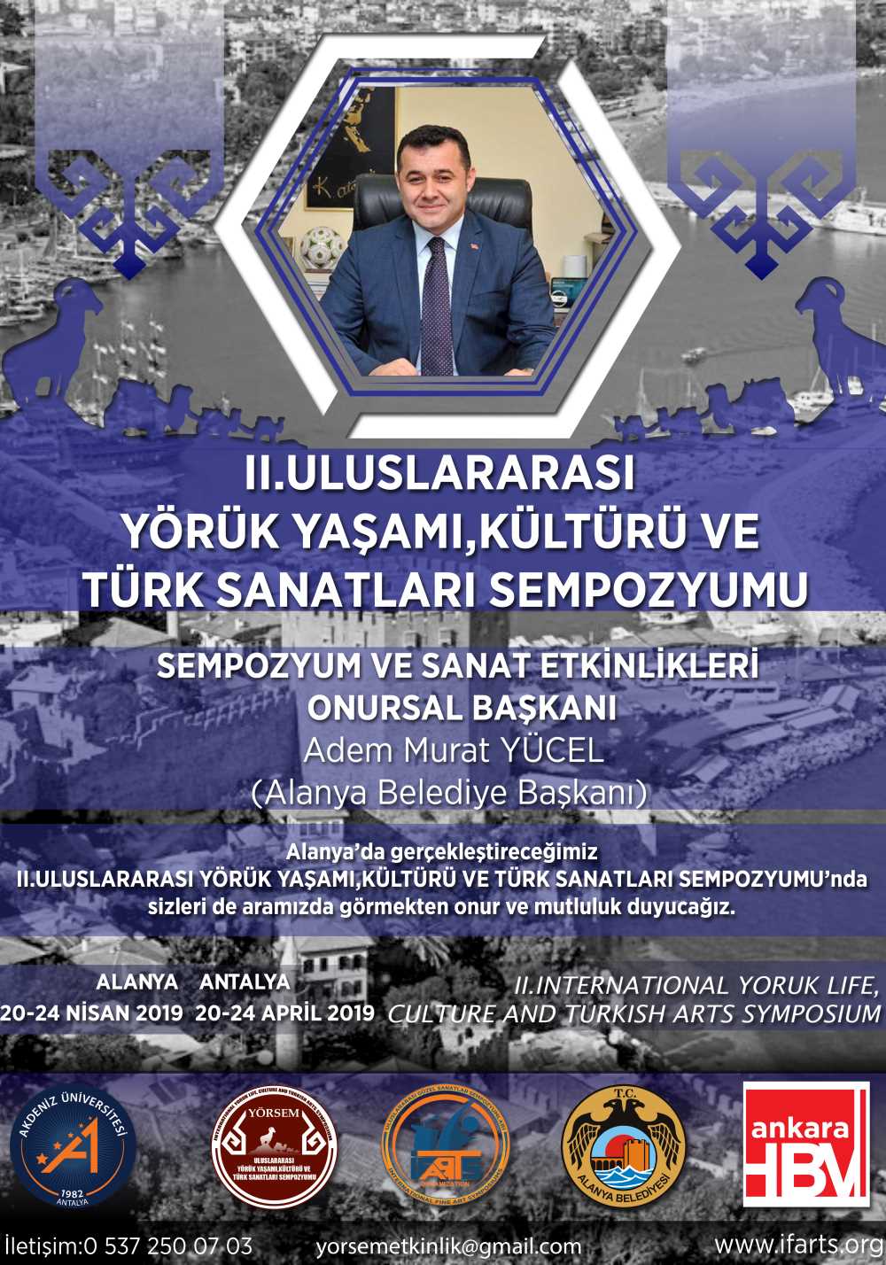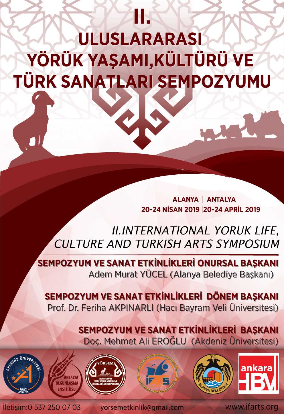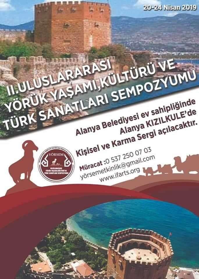 Alanya Belediyesi ev sahipliğinde, Antalya Olgunlaşma Enstitüsü Müdürlüğü, Akdeniz Üniversitesi Yörük Kültürü Araştırma Merkezi (YÖRKAM) Müdürlüğü ve Geleneksel Türk Sanatları Bölümü, Göç eden Sarıkeçili Yörük Derneği destekleri ile 2. Uluslararası Yörük Yaşamı Kültürü ve Türk Sanatları Sempozyumu, 20-24 Nisan 2019 tarihleri arasında Alanya’da yapılacak. Ayrıca sempozyum kapsamında Alanya Kızılkule’de kişisel ve karma sergi açılacak.