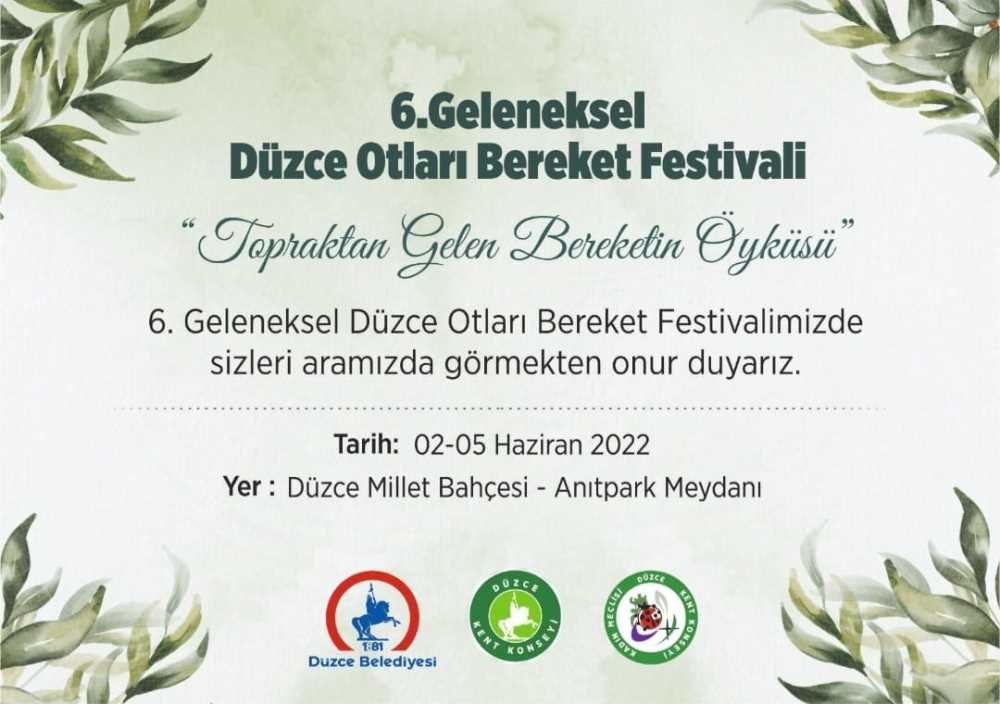 2-5 Haziran 2022 tarihlerinde düzenlenecek olan 6.Geleneksel Düzce Otları Bereket Festivali İlimiz Anıtpark Meydanı Millet Bahçesinde çeşitli etkinliklerle gerçekleştirilecektir.