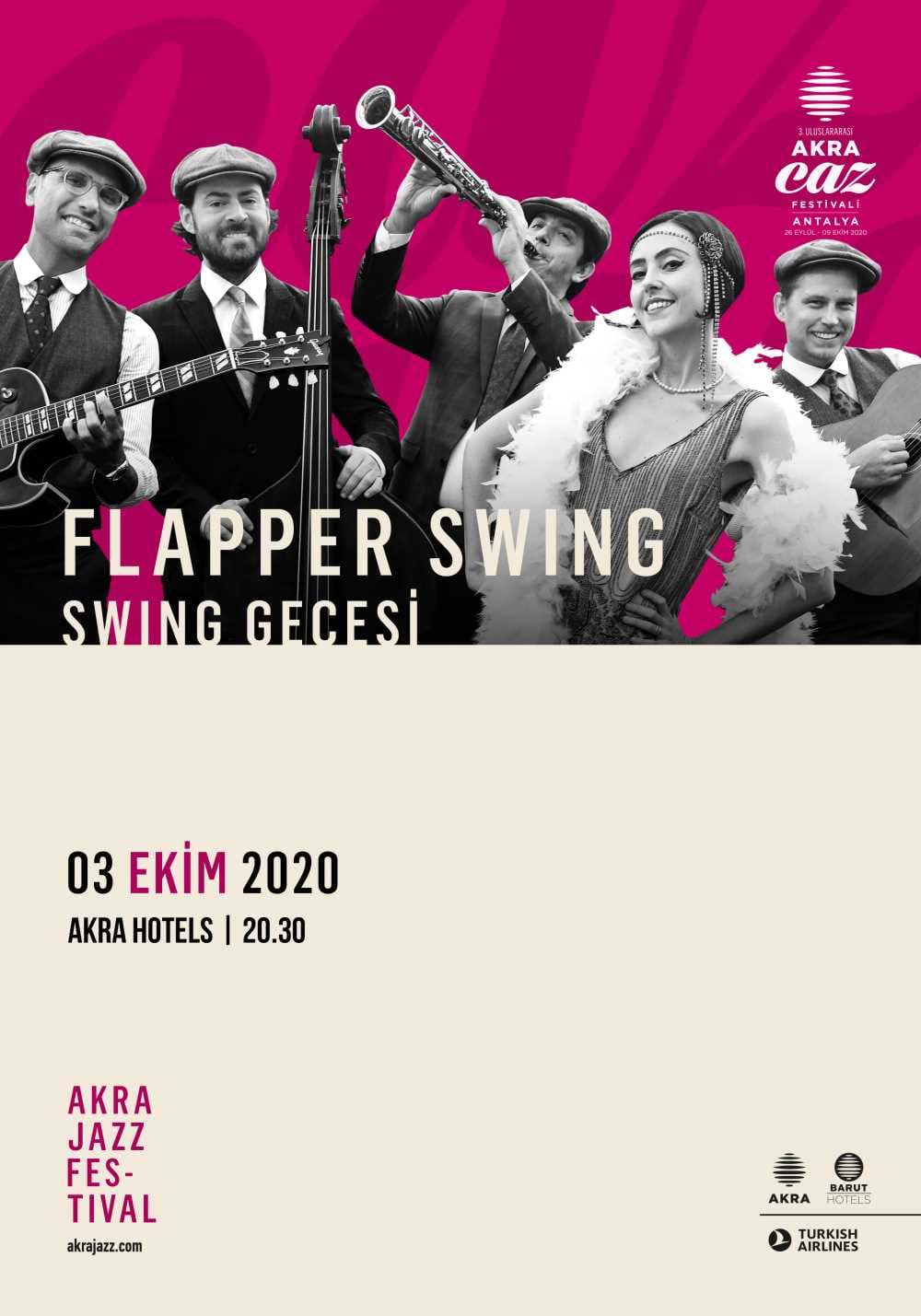 Akustik bir caz manouche grubu olan Flapper Swing, 1920’li ve 30’lu yılların caz standartlarını seslendirecekleri “Swing Gecesi” ile 3 Ekim akşamı izleyenlere festivalin en renkli konserlerinden birini yaşatacak. Gecede Flapper Swing’e, swing döneminin muhteşem danslarıyla “Swing Dance Antalya” eşlik edecek.