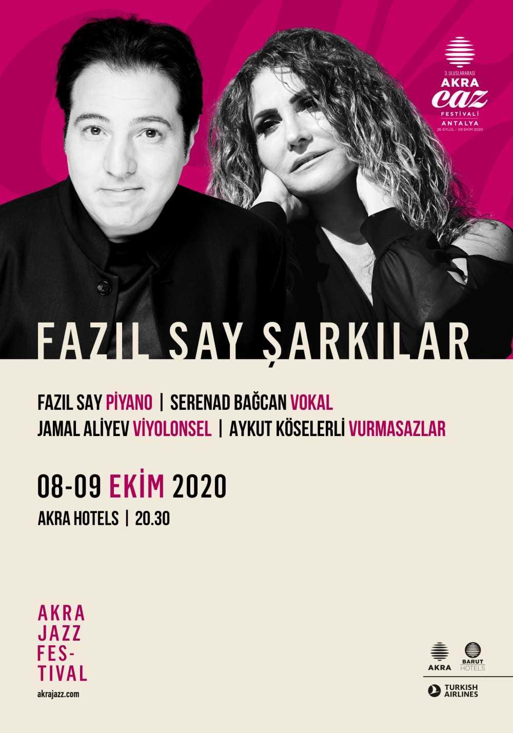 Dünyaca ünlü piyanist ve besteci Fazıl Say, üçüncü yılında da festivali yalnız bırakmıyor. 8 ve 9 Ekim tarihlerinde iki konser ile sanatseverlerle buluşacak olan sanatçının, Türk edebiyatının unutulmaz şair ve yazarlarının şiirlerini bestelediği şarkı albümlerinin dördüncüsü olan yeni albümü Antalya’da ilk kez dinleyenlerle buluşacak. Fazıl Say şarkılarını güçlü sesi ve büyüleyici sahne performansıyla solist Serenad Bağcan yorumlayacak. Vurmasazlarda Aykut Köselerli, viyolonselde Jamal Aliyev eşlik edecek.