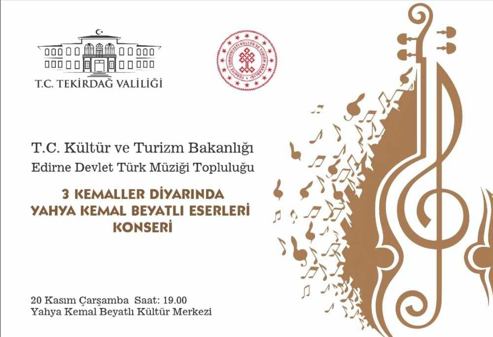 Kültür ve Turizm Bakanlığı Edirne Devlet Türk Müziği Topluluğu tarafından Yahya Kemal Beyatlı Eserlerinden oluşan Konser icra edilecektir.