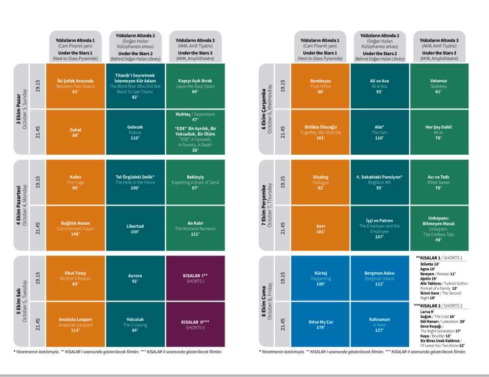 Ulusal Belgesel ve Kısa Metraj Film Yarışması söyleşileri, gösterimlerin ardından Yıldızların Altında 3 Açık Hava Sineması’nda yapılacak. Uluslararası Uzun Metraj Film Yarışması’nda yer alan filmlerin yönetmenleriyle yapılacak söyleşiler, Yıldızların Altında 2 Açık Hava Sineması’nda gösterim sonrası gerçekleşecek.