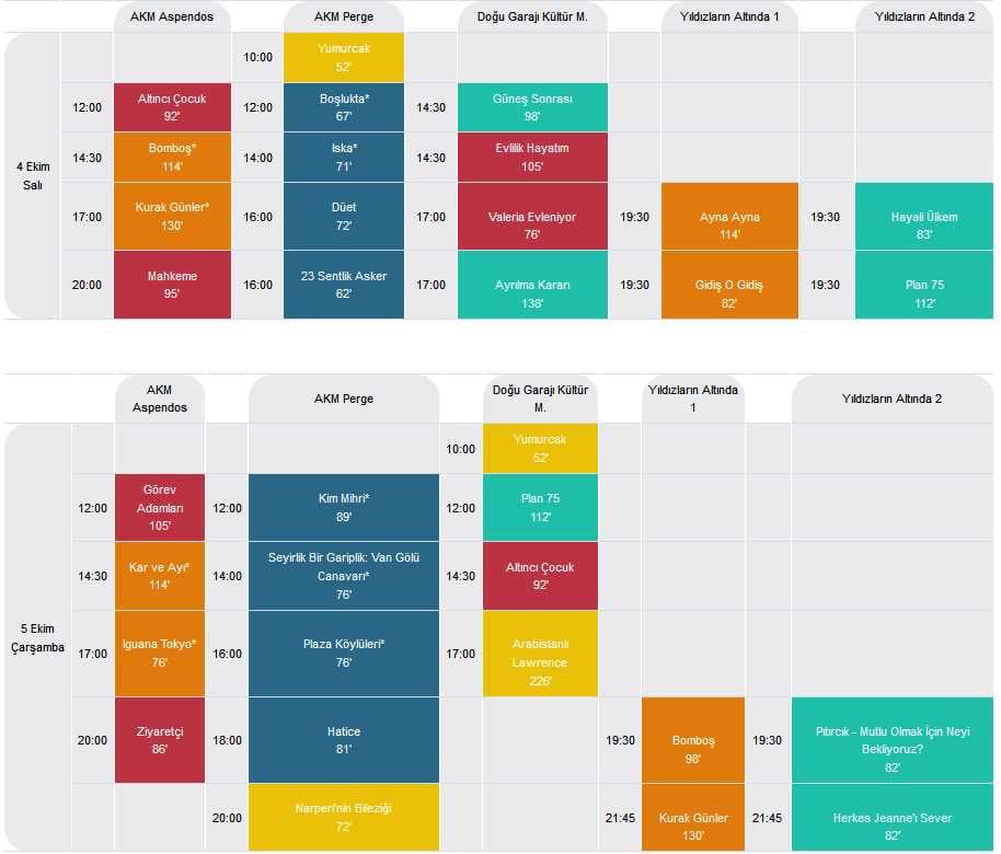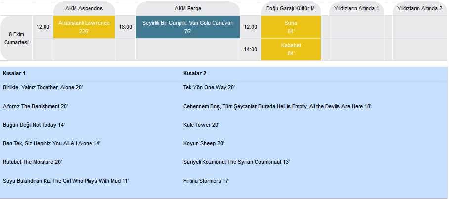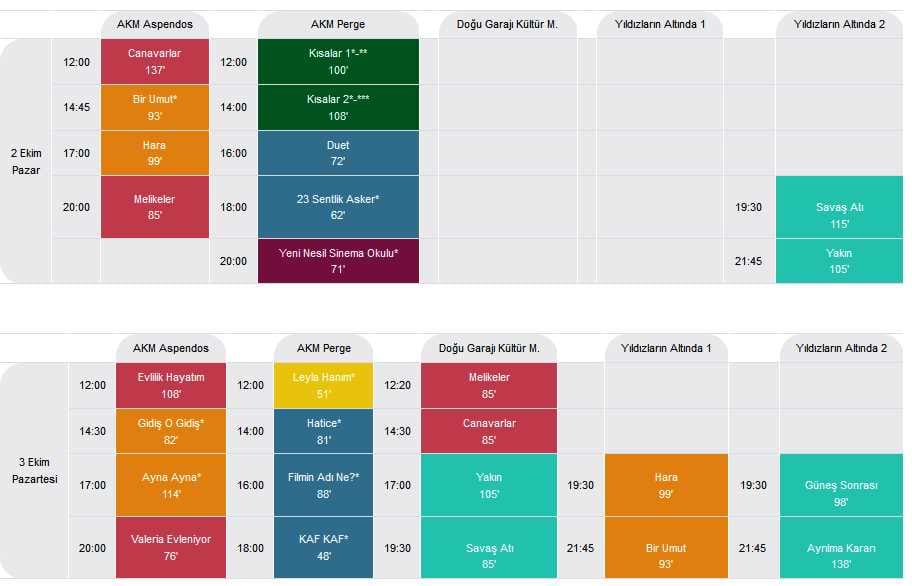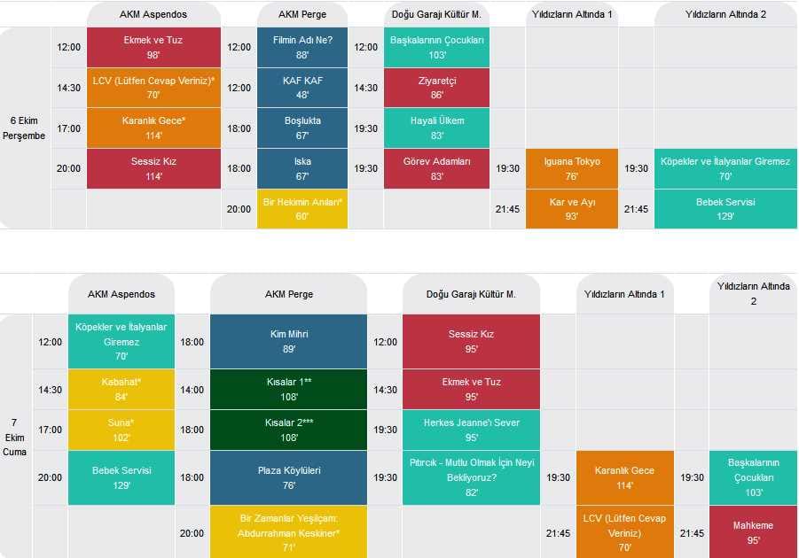 - AKM Aspendos ve Perge salonları, Doğu Garajı Kültür Merkezi, Karaalioğlu Parkı içindeki Yıldızların Altında 1 ve AKM Doğan Hızlan Kütüphanesi arkasındaki Yıldızların Altında 2 salonlarında gösterilecek filmler, 19.30 ve 21.45 olmak üzere 2 seans şeklinde izlenebilecek.