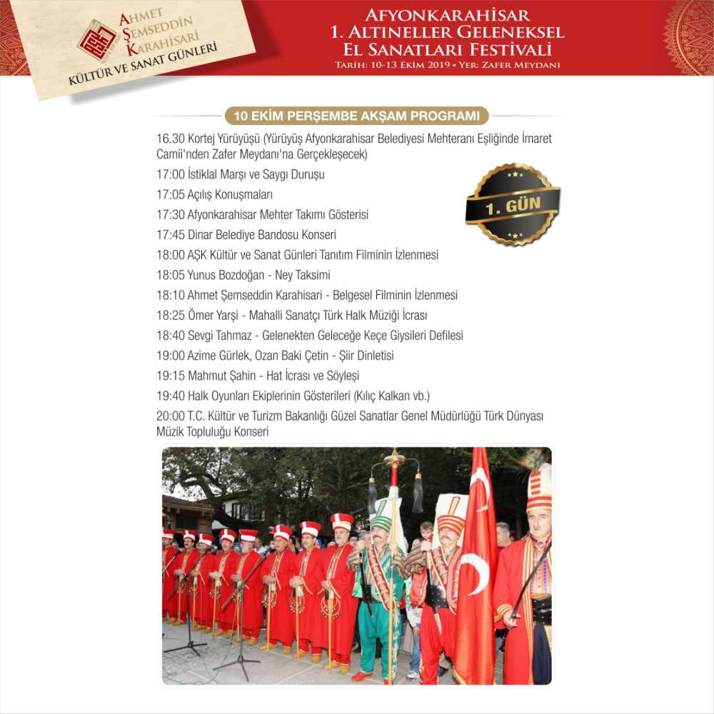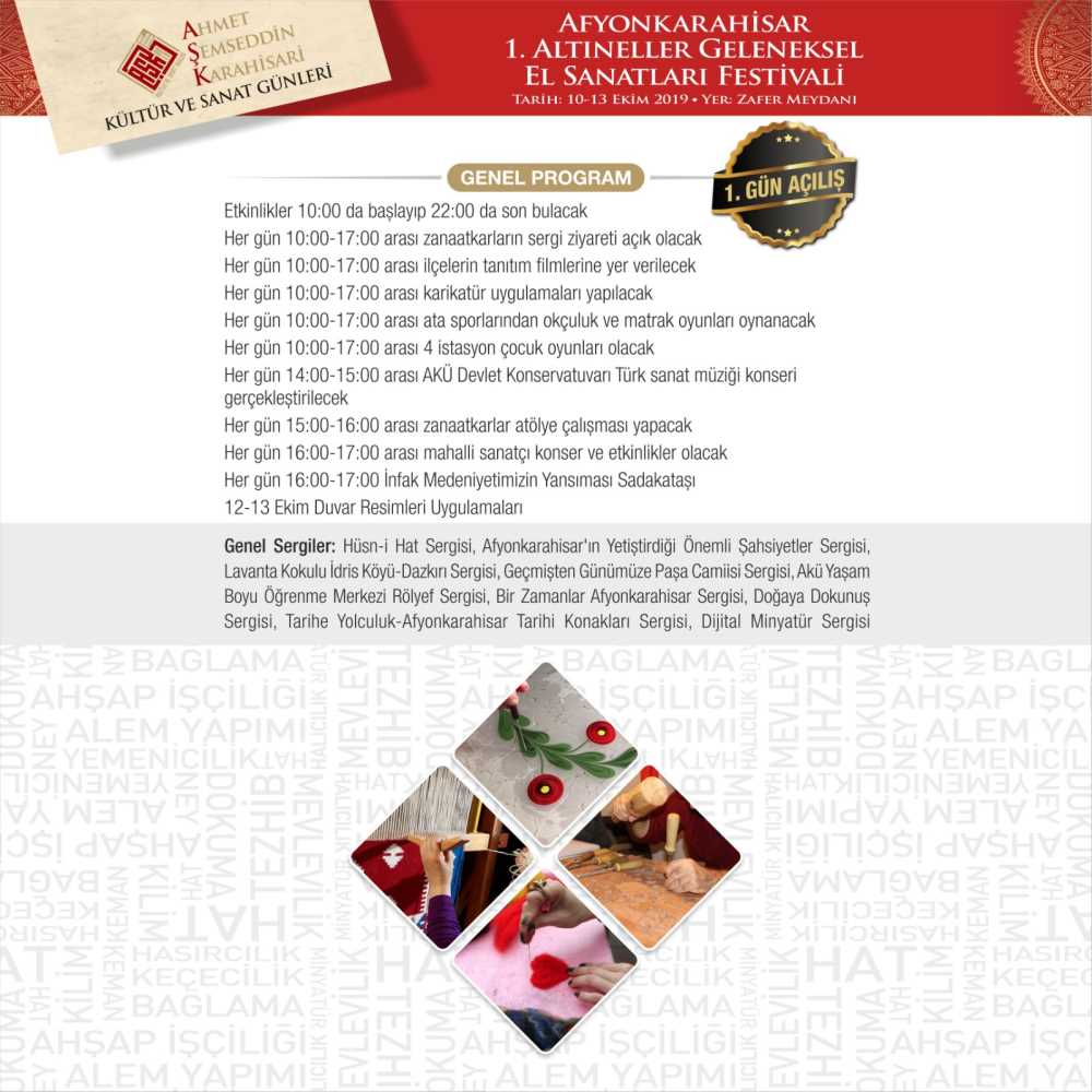 AŞK Kültür ve Sanat Günleri kapsamında; 10-13 Ekim’de Afyonkarahisar 1. Altıneller Geleneksel El Sanatları Festivali, Zafer Meydanı’nda el sanatları ustalarının sunumları, atölye çalışmaları, geleneksel sporlar, konserler, hat çalışmaları, filmler, sergiler, ürünlerin tanıtımı, şiir şöleni, halk oyunları, orta oyunu, konferans, tiyatro ve söyleşiler yer alacak.