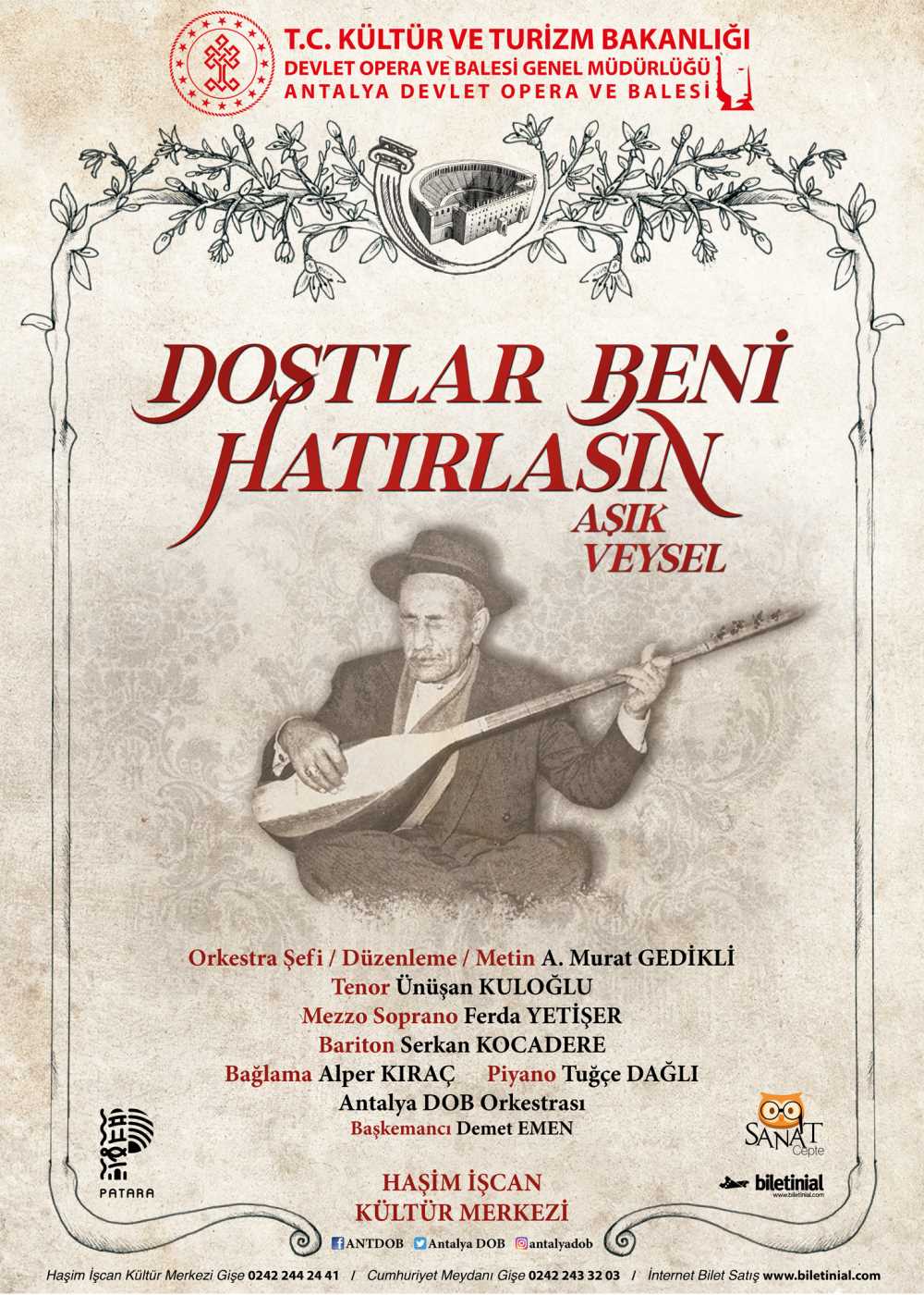 Âşık geleneğinin önemli temsilcilerinden halk ozanı Âşık Veysel Şatıroğlu için Haşim İşcan Kültür Merkezi Opera Sahnesi'nde "Dostlar Beni Hatırlasın" konseri gerçekleştirilecek. Konserde; şef Ahmet Murat Gedikli yönetimindeki Antalya Devlet Opera ve Balesi orkestrası eşliğinde, âşık geleneğinin Anadolu'daki son büyük temsilcilerinden olan Âşık Veysel'in gönüllere taht kurmuş şiirleri ve hikayeleri, solistlerin yorumlarıyla, sanatseverlerle buluşacak.