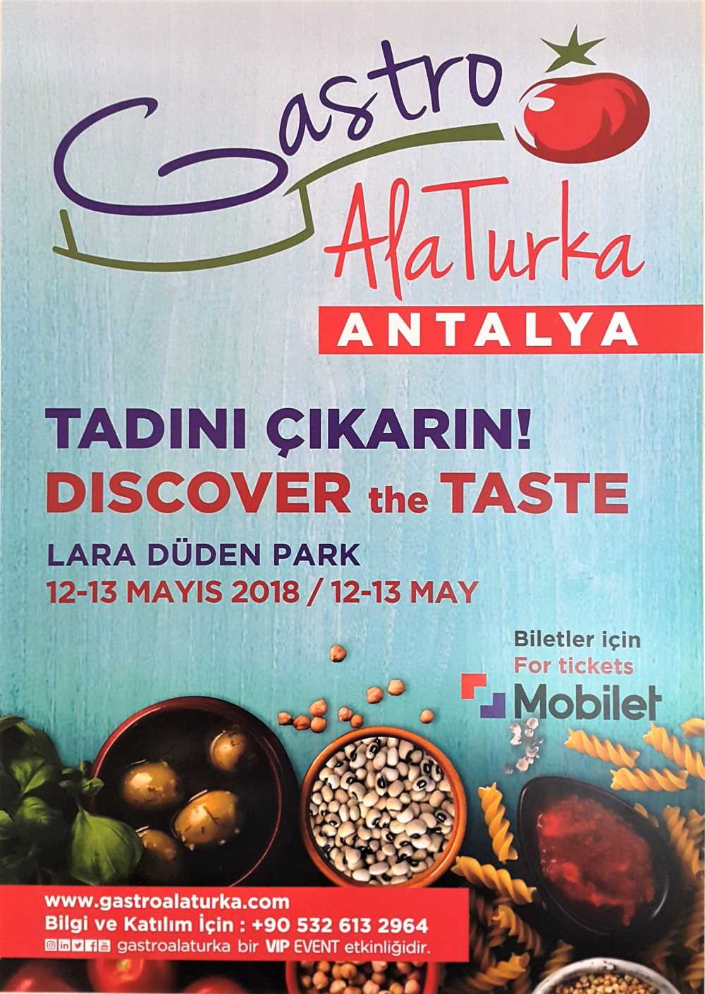 Türkiye'yi dünyanın gözünde bir gastronomi noktası olarak tanıtmak ve kadim Türk mutfak kültürünün dünyada yaygınlaşmasını sağlamak amacıyla yola çıkan "Gastro Alaturka" etkinliklerinin ilki, 11 – 13 Mayıs 2018 tarihleri arasında, Antalya Lara Düden Park’ta gerçekleştirilecek. Şehir Pazar Yeri konseptinde; gastronominin, lezzetin, eğlencenin ve inovasyonun bir araya geldiği bir buluşma olarak tasarlanan ve ülke çapında 6 yörede gerçekleştirilmesi planlanan etkinlikler dizisinin ilk ayağı olan “Gastro Alaturka – Antalya 2018” kapsamında birbirinden ilginç etkinlikler düzenlenecek. Yer sofrası gibi Türk kültürüne özgü farklı sofralarda yemek, Antalya’da Elmalı yöresel yemekleri sunumları, dünyaca ünlü şeflerin masalarında özel konuklarla ziyafet, yemek sanatı yarışmaları, sokak lezzetleri, konuşma ve sunumlar, konserler ve dj performansları bu aktivitelerden sadece birkaçı olacak.