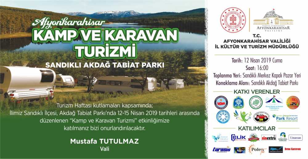 Her yıl olduğu gibi bu yılda 15-22 Nisan 2019 tarihleri arasında kutlanacak olan “Turizm Haftası” etkinlikleri kapsamında; 12-15 Nisan 2019 tarihleri arasında İlimiz, Sandıklı İlçesi Akdağ Tabiat Parkı’nda ilk defa “Kamp ve Karavan Turizmi “etkinliği gerçekleştiriyoruz.