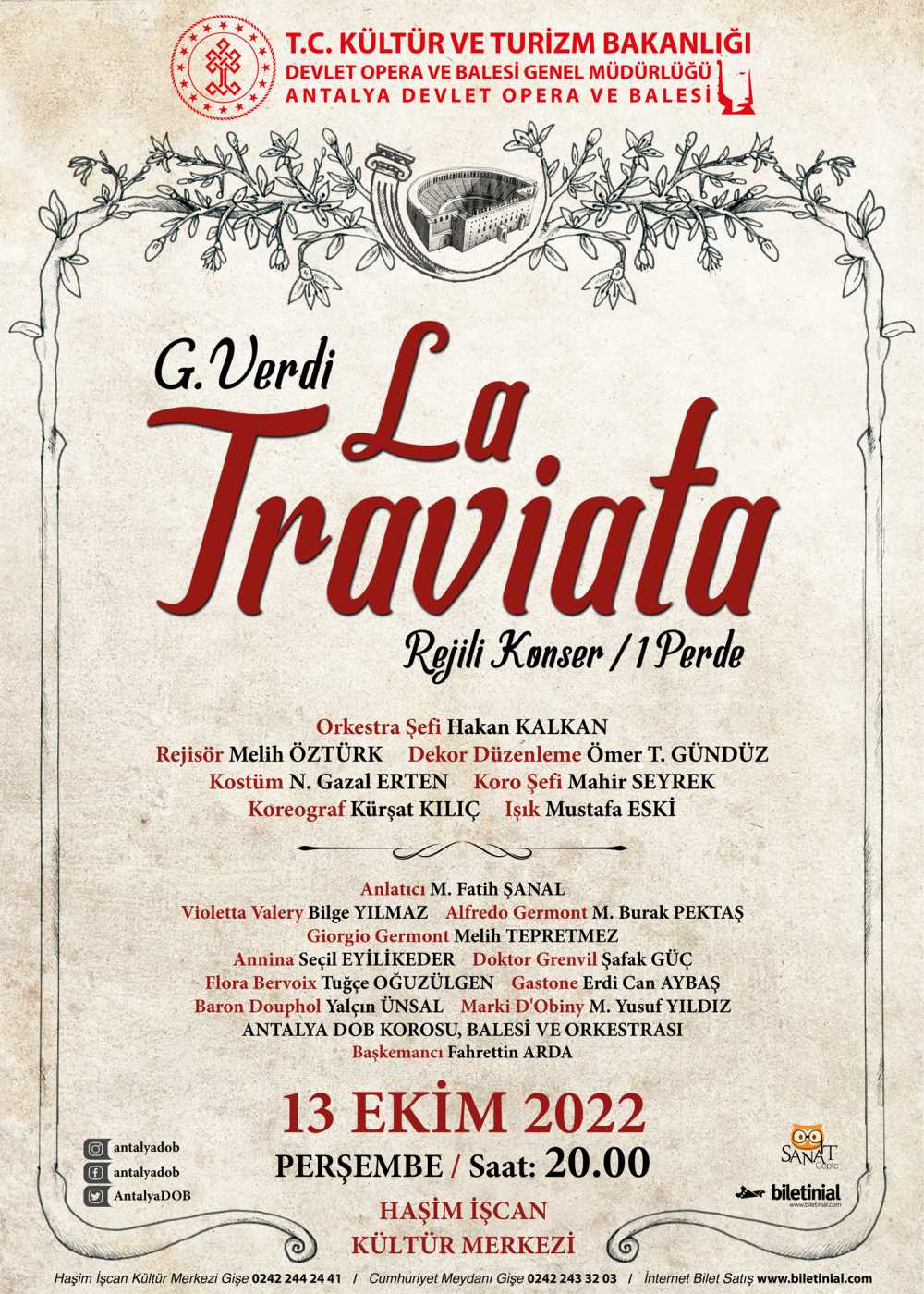 Giuseppe Verdi'nin bestelediği La Traviata operası, Alexandre Dumas'nın 1848 yılında yazdığı Kamelyalı Kadın romanını temel almıştır. Verdi'nin karakteristik özelliklerinden olan; oldukça büyük bir koro, yine çok sayıda rol ve yardımcı roller, dansçılar, figüranlar kullanmak, bu operasında da mevcuttur. Eser 4 perde yerine 1 perde olarak; orkestranın da sahne üzerinde olduğu rejili konser formatında ve bir anlatıcı eşliğinde sergilenecektir.