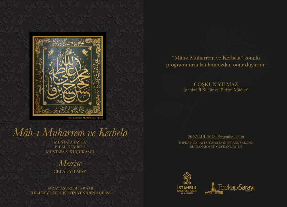 20.09.2018 tarihinde Topkapı Sarayı Müzesi Konferans Salonunda Mustafa Fayda, Bilal Kemikli, Mustafa S. Küçükaşçı'nın katılımıyla "Mâh-ı Muharrem ve Kerbela" konulu program gerçekleştirilecektir.
