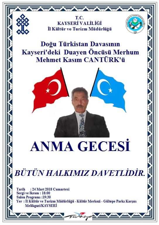 Müdürlüğümüz ile Kayseri Kültür ve Turizm Derneği birlikteliğinde düzenlenen Doğu Türkistanlıların Kayseri'deki duayen öncülerinden değerli fikir adamı merhum Mehmet Kasım CANTÜRK'ü anma programına bütün halkımız davetlidir.