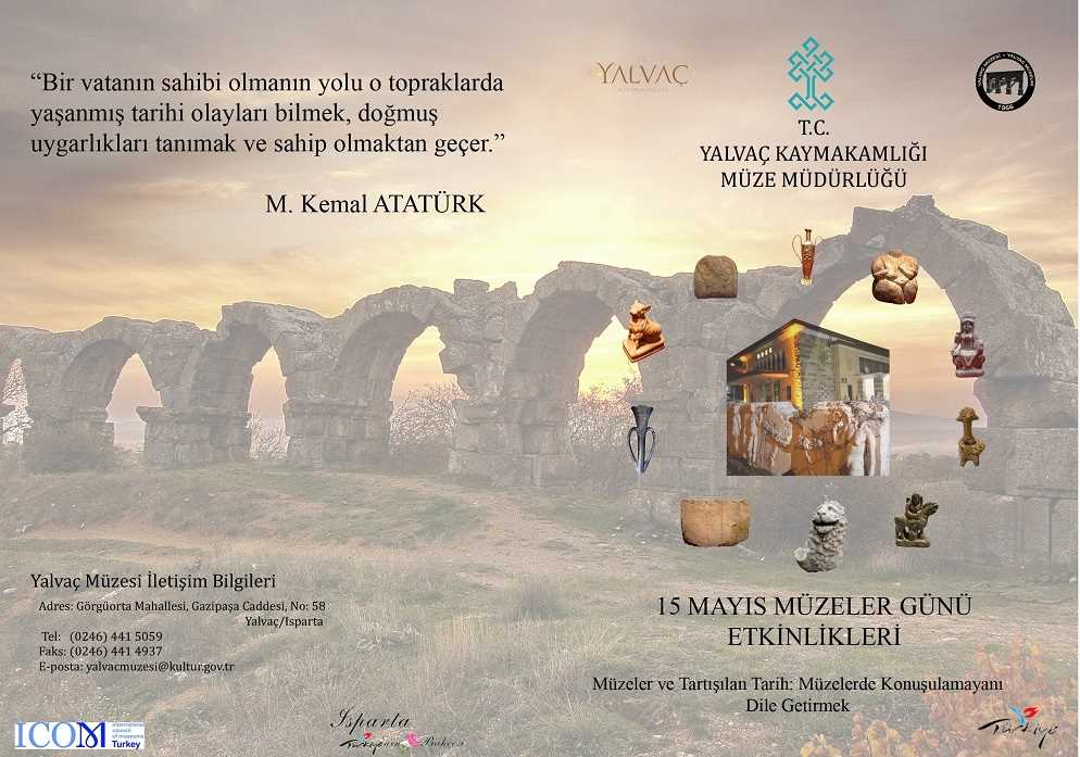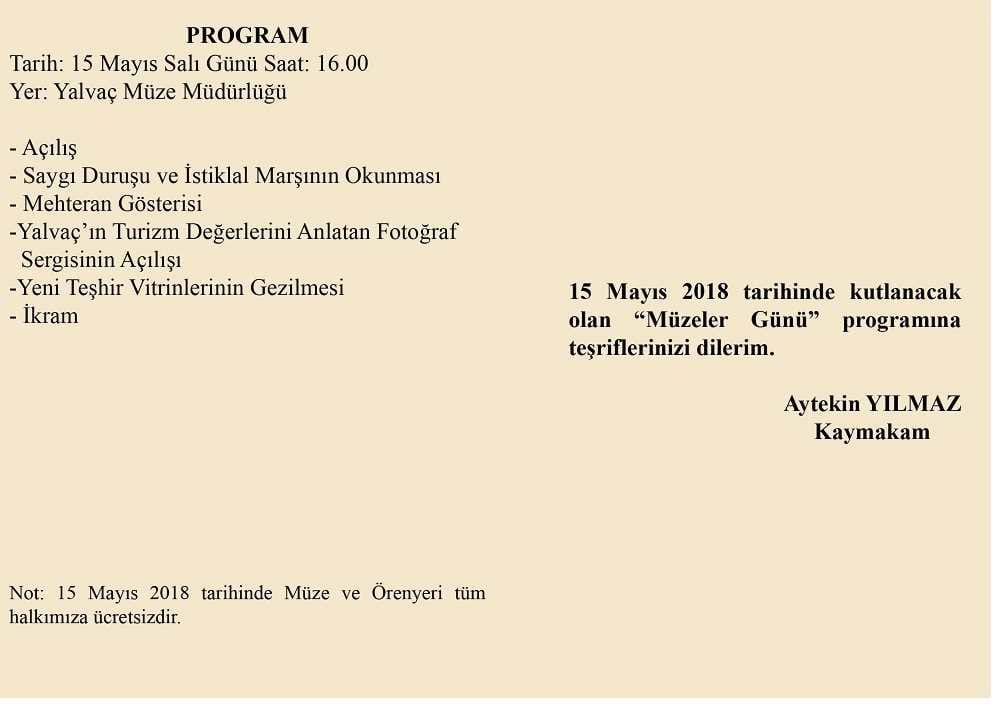Tüm dünyada ve ülkemizde her yıl kutlanan Müzeler Günü 15 Mayıs Salı günü saat:16.00’da Yalvaç Müzesi Müdürlüğünde çeşitli etkinliklerle kutlanacaktır. Bu kapsamda; Mehteran, sergi açılışı ve yeni teşhir salonlarının tanıtımı yapılacaktır. Söz konusu kutlama etkinliklerine tüm kültür ve sanat severler davetlidir.