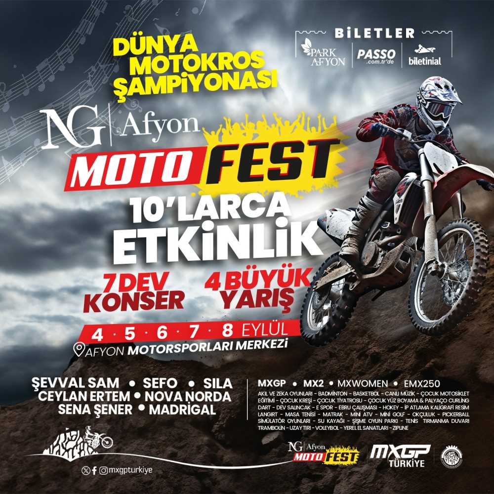 Dünyanın en iyi motokros yarışçılarının yer alacağı Dünya Motokros Şampiyonası’nın (MXGP) Türkiye etabı 7-8 Eylül 2024’de ve Türkiye’nin 2023 yılındaki en büyük gençlik ve spor etkinliği Türkiye MOTOFEST 4-5-6-7-8 Eylül 2024 tarihlerinde Afyonkarahisar’da yapılacak. Dünyanın en popüler spor yarışları arasında yer alan MXGP Dünya Motokros Şampiyonası 6. yılda 7 kez yapılacak ve yarışlarda hız, adrenalin, tutku, eğlence sizlerle buluşacak.
