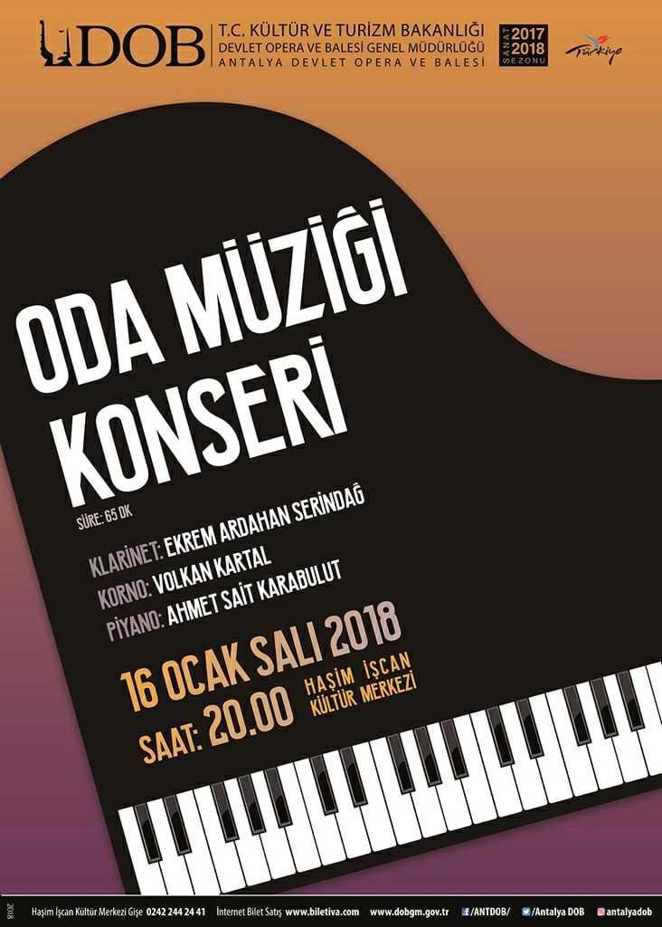 W.A. Mozart'ın Piyano Sonata No:12, Brahms'ın Intermezzo op.118 No:2, Chopin'in Scherzo No:2 ve Carl Reinecke'in Piyano, Klarinet ve Korno için Trio, Op.274 eserlerinin seslendirileceği konserde klarinet sanatçısı Ekrem Ardahan Serindağ, korno sanatçısı Volkan Kartal ve piyanist Ahmet Sait Karabulut sahne alacak.