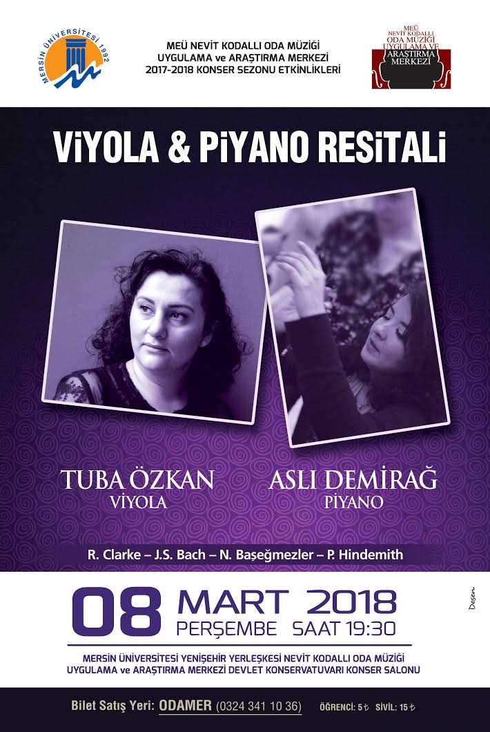2017-2018 Konser Sezonu Programı dahilinde 8 Mart 2018 Perşembe günü saat 19.30'da Nevit Kodallı Oda Müziği Uygulama ve Araştırma Merkezi konser salonunda yapılacak olan Oda Müziği Dinletisi ''Viyola-Piyano Resitali'' sanatçılar Tuba Özkan ve Aslı Demirağ'ın katılımıyla Yenişehir Kampüsünde gerçekleştirilecektir.