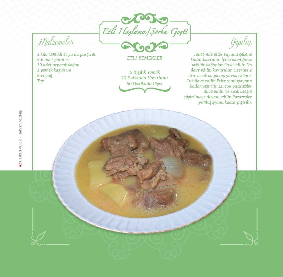 Tencerede etler suyunu çekene kadar kavrulur. İçine istediğiniz şekilde soğanlar ilave edilir. Un ilave edilip kavrulur. Üzerine 2 lt sıcak su yavaş yavaş eklenir. Tuzu ilave edilip yumuşayıncaya kadar pişirilir. En son patatesler ilave edilir ve patatesler de yumuşayıncaya kadar kısık ateşte pişirilmeye devam edilir.