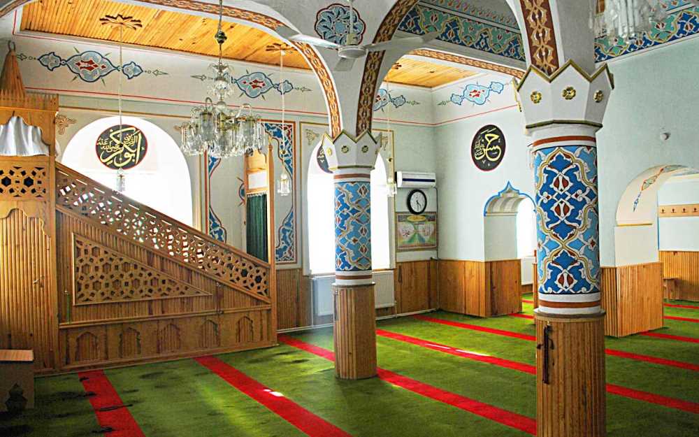 ve batı duvara paralel uzanan minber ahşaptır.Minber girişini bez bir perde kapatır. |