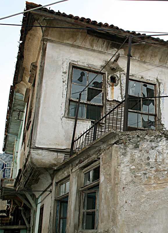 İki yapı kütlesinden oluşan bina farklı iki kullanıma sahip iki ayrı konuttan oluşmaktadır. Konutlardan birinin günümüzde kullanımı devam ettiği için iyi durumda olmasına karşılık diğer yapı harap durumdadır. Bir avludan yapıya girildiği tespit edilen ancak çöplük haline gelmiş olan avludan geçilemediği için içeri girilemeyen yapının plan ve iç mekan elemanları itibariyle nitelikli bir konut olduğu düşünülmüştür. Saçak profilleri ve yan binayla olan birleşimi ilgi çekici şekilde fark edilen yapı, cephe özellikleriyle geleneksel dokuya uyum sağlamaktadır. Alaturka kiremit örtülü kırma çatısı bulunan iki yapı da zemin katta moloz taş örgülü olup, üst katta bağdadi sistem üzerine sıvalıdır. Konutlardan birinin ön kısmında son dönemde yapıldığı fark edilen çeşitli eklemeler mevcuttur. |