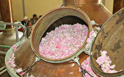Parfüm ve Kozmetik sanayinin en önemli ve pahalı ham maddelerinden olan gül yağı pembe yağ güllerinin buharlı distilasyon (damıtma) yöntemiyle kaynatılarak üretilir.Dünya standartlarına uygun kalitede gül yağı deniz seviyesinin 1050 m. ve daha fazla yüksekliklerde yer alan, Isparta ve yöresinde yetiştirilen güllerden elde edilir. Her yıl Mayıs ve Haziran aylarında toplanan güller, hava şartlarının da katkısı sonucu üstün kalitede gül yağı üretiminin gerçekleştirilmesini sağlar. Gül Yağı Üretimi günlük ve sabah erken gül bahçelerinden toplanan gül çiçekleri fabrika gül ambarında, işletme gereği 500 kg.'lık öbekler halinde dizilerek üretime hazır hale getirilir. Çiçek kazanlarına 1500 litre su doldurularak (çiçek kazanlarında bulunan belirli seviyeye kadar su doldurularak) üzerine tartımla 500 kg. gül çiçeği basılır. Kapaklar kapandıktan sonra, müberit eksperleri tarafından 2-3 Atmosfer su buharı basıncı altında destilasyona (damıtılma) tabi tutulur. Yoğunlaşan yağlı su termostattan 30-35 derece altında ortalama 70-80 dakika damıtma yapılır.